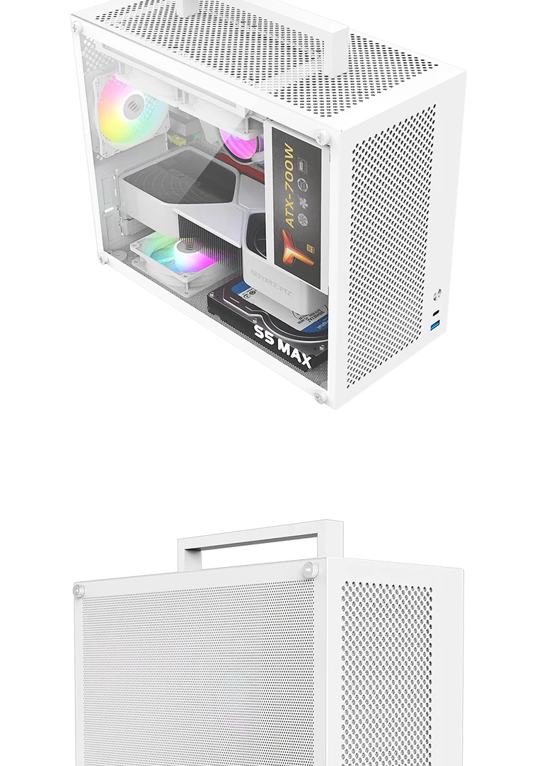 El ancho del gabinete es de 16 cm, lo que lo hace muy compacto, y con una profundidad de 14 cm, puede alojar una tarjeta gráfica de 330 mm si se trata de una fuente de alimentación ATX. Sin embargo, podría ser difícil de manejar a menos que se utilicen cables flexibles, como los de las fuentes de alimentación Corsair. El ventilador de la fuente de alimentación se instaló mirando hacia adelante, y los cables internos se sujetaron con bridas a las perforaciones del panel de la carcasa y se aseguraron en su lugar. Elegí el modelo Messi para el panel lateral, pero terminé operándolo con el lateral abierto todo el tiempo. El grosor de la funda es de 0.6mm, pero es suficiente ya que no se llevará con frecuencia. Core Ultra 7 265K Thermalright Peerless Assassin 120 MINI Asus B860 TUF Gaming M Plus. DDR5 32 GB × 2 SSD gen5 de 2TB SSD gen4 de 4TB 3.5HDD 8TB Corsair 3.1v RM850e 2025. AINEX 92mm silencioso CFY-90S × 3