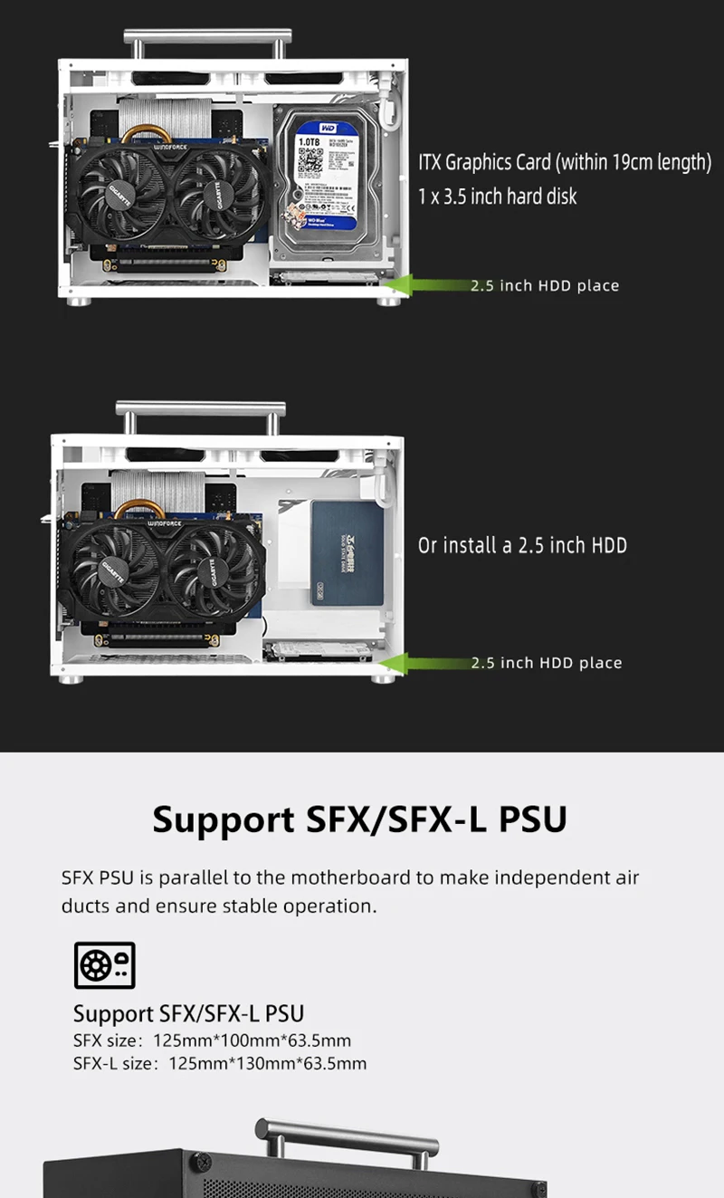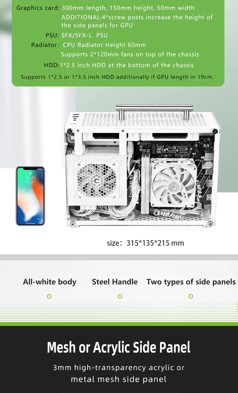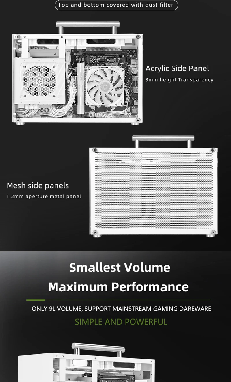 Comprar METALFISH T60 Mini ITX caja negra 9L con Panel lateral acrílico o malla y soporte de mango portátil SFX PSU/310mm GPU/2*120mm ventilador