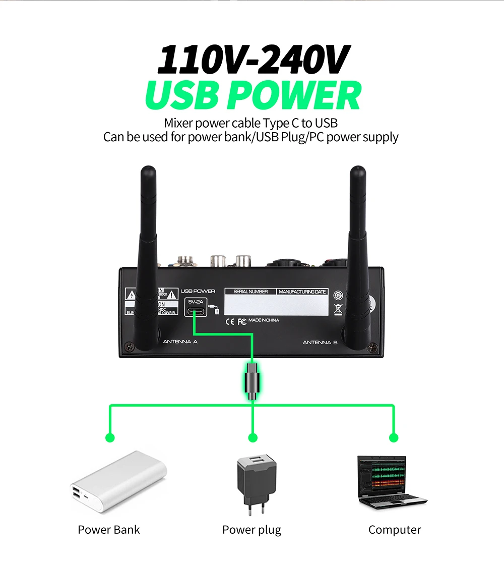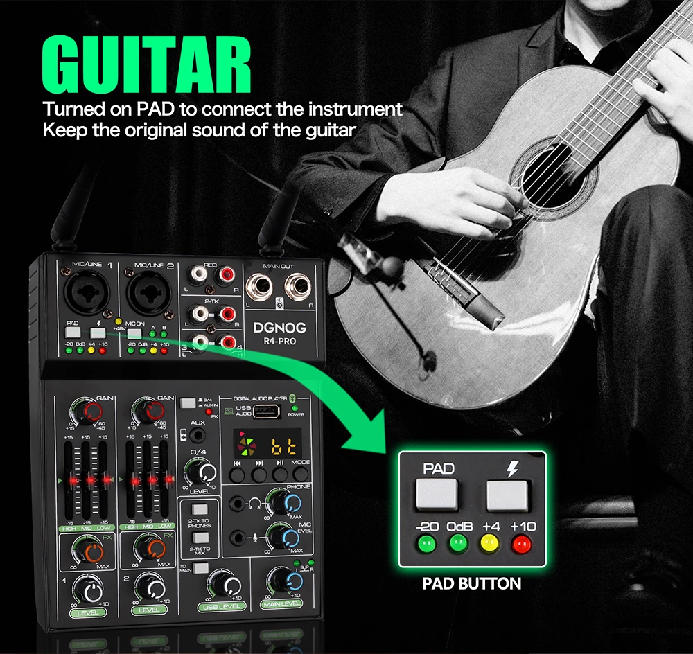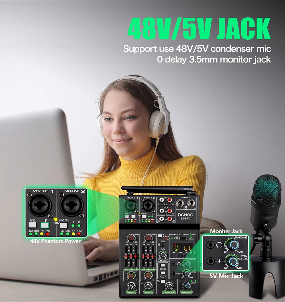 【STREAMING INALÁMBRICO BLUETOOTH】Capacidad de transmisión de audio sin complicaciones y sin cables directamente a la unidad de la consola. Este mezclador de audio puede transmitir música de forma inalámbrica desde iPad, iPhone y teléfono inteligente Android con mesa de mezclas.