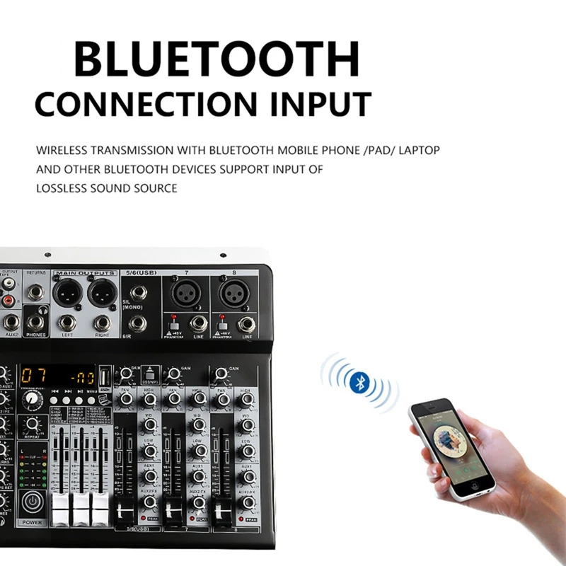 AUX Audio Input More Device Connections: Digital mixer with left and right sound channel interfaces, the signal source can be connected with the connection line, for Smart TV, DVD, DVD player, Desktop computer,Laptop, Mobile device audio.