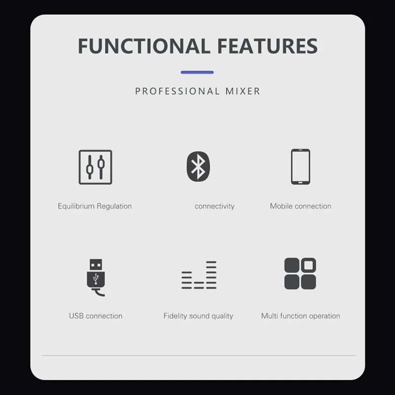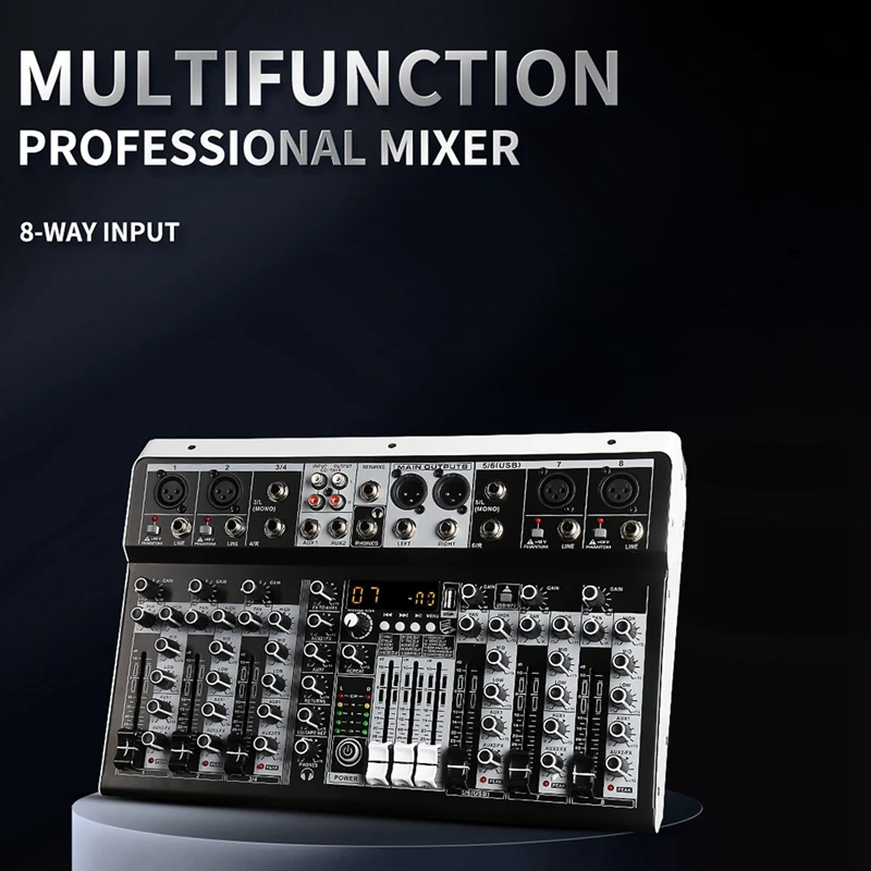 Description: Multifunction Professional Mixer: Audio mixer, equilibrium regulation, mobile connection, USB connection, fidelity sound quality, Multi function operation.