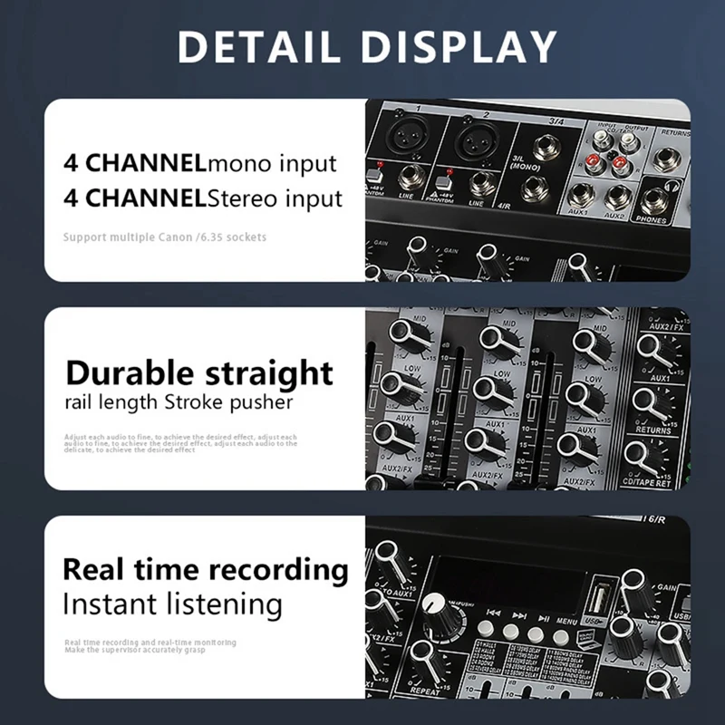 Digital Processor: Digital mixer built in digital effect processor, fast response Professional output has better reverberation effect. Recording And monitoring, Can record high fidelity audio with external recording equipment external monitoring equipment can monitor input audio convenient tuning.