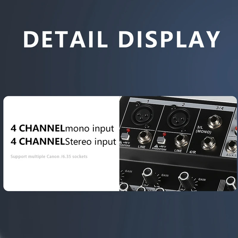 AUX Audio Input More Device Connections: Digital mixer with left and right sound channel interfaces, the signal source can be connected with the connection line, for Smart TV, DVD, DVD player, Desktop computer,Laptop, Mobile device audio.
