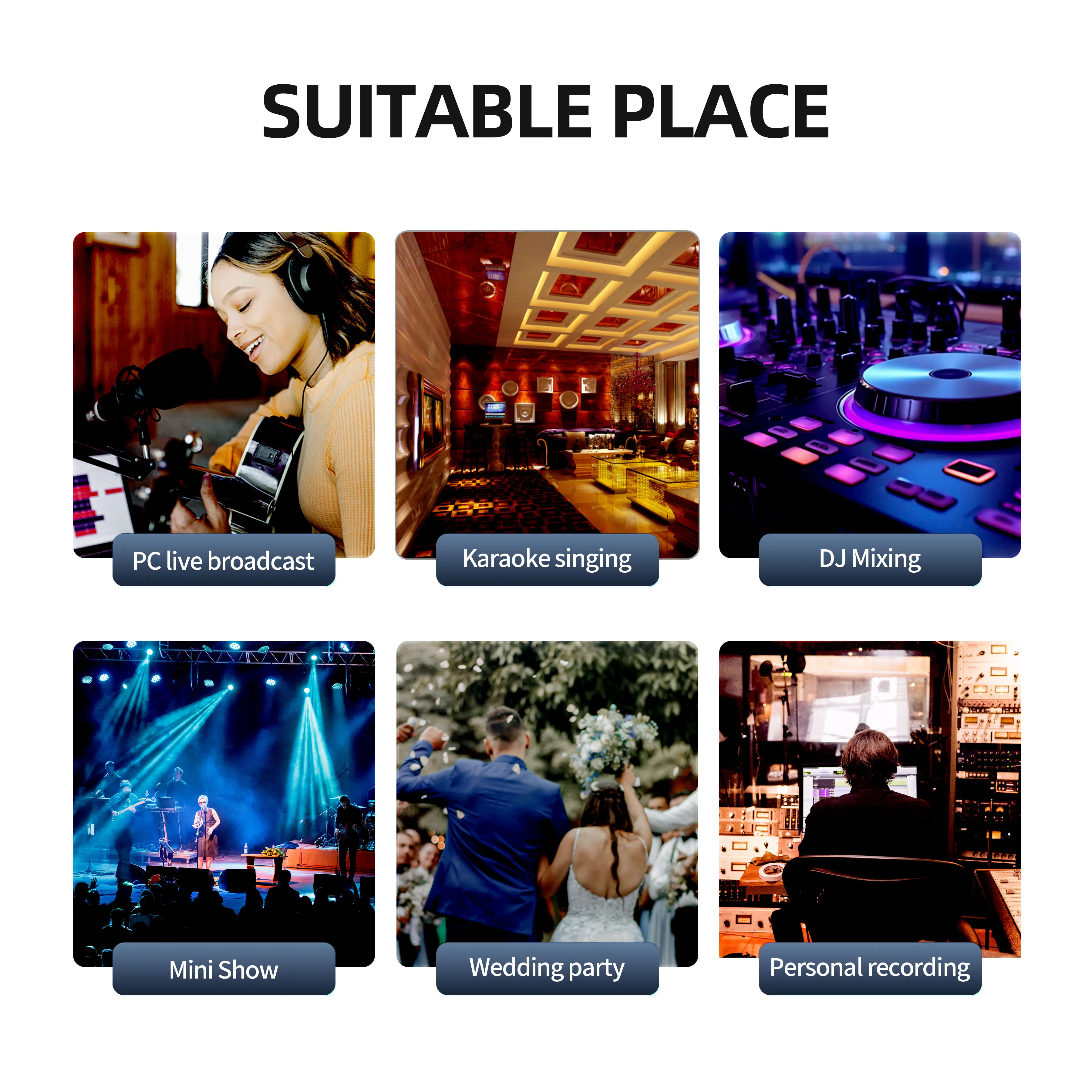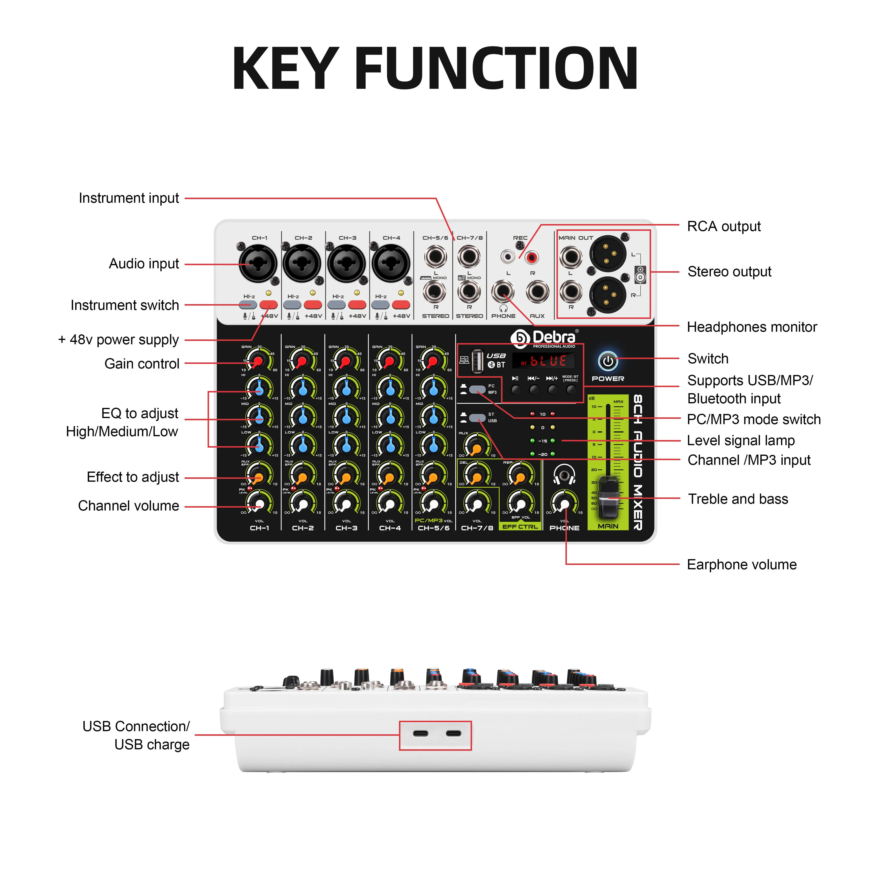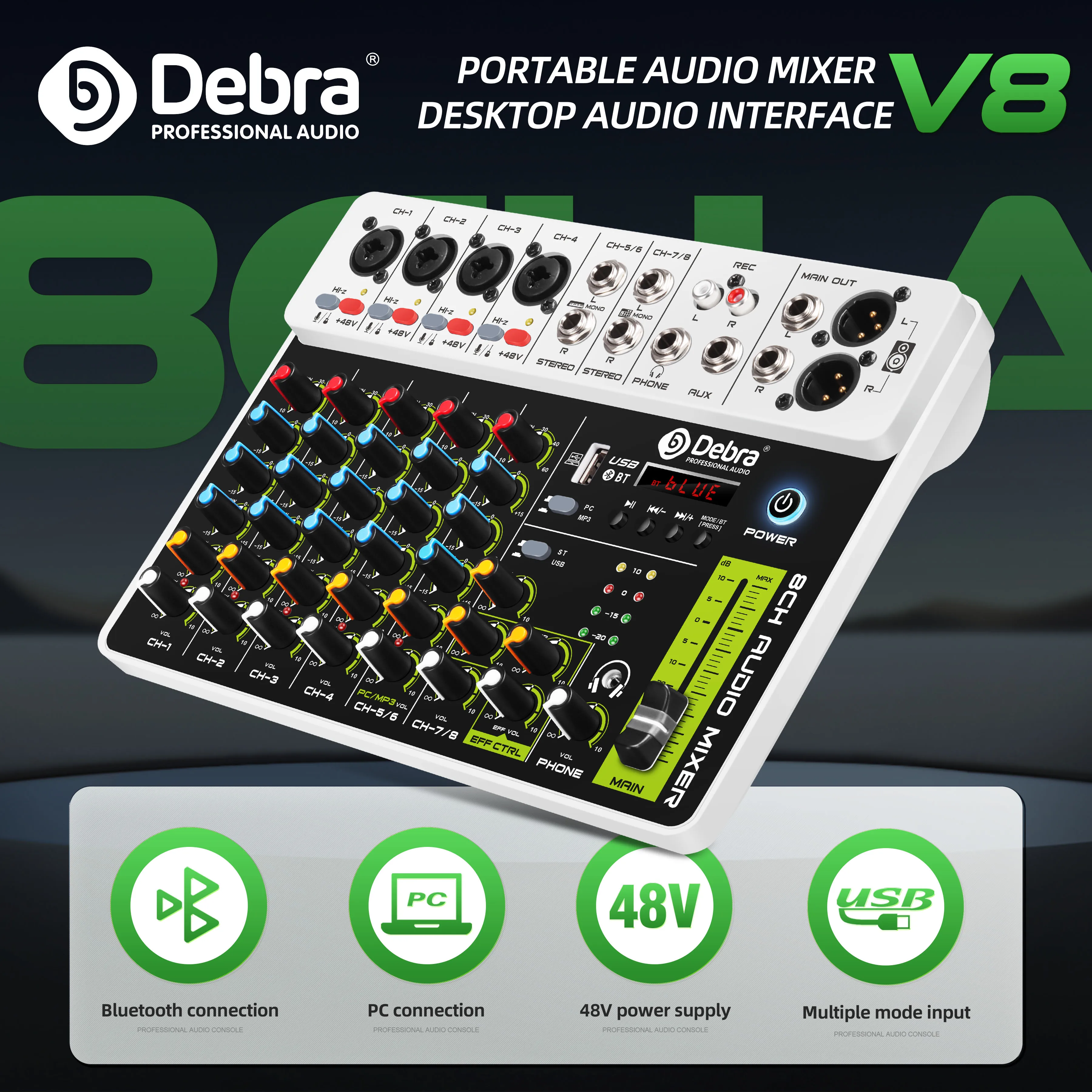 Comprar Mezclador de Audio Debra, consola de DJ V8, 8 canales, 48V, alimentación fantasma, consola de DJ USB con tarjeta de sonido para grabación de PC y canto