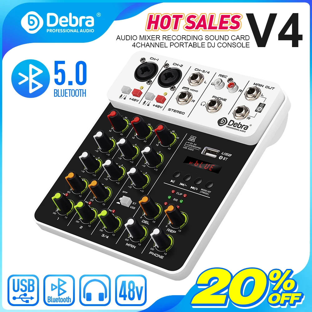 Comprar Mezclador de Audio Debra V4 de 4 canales con Bluetooth USB 48V efecto repetido de retardo de energía fantasma para consola mezcladora de sonido grabación de PC