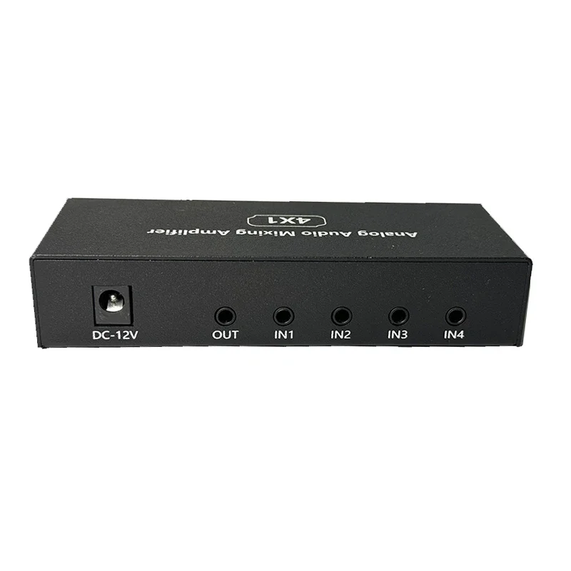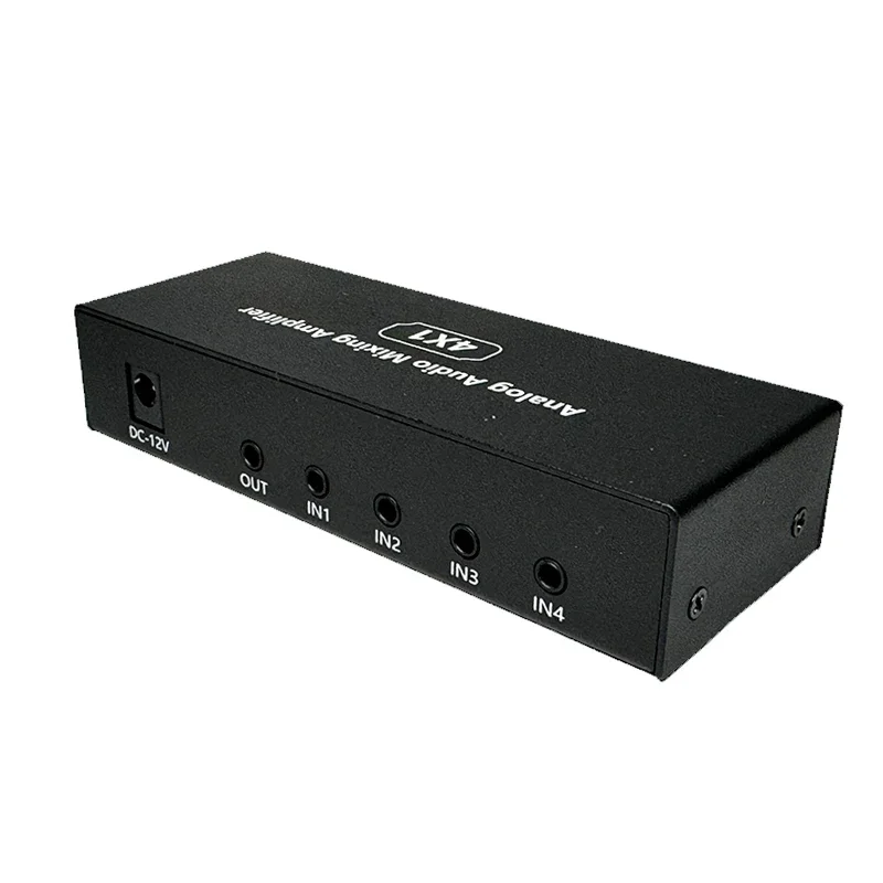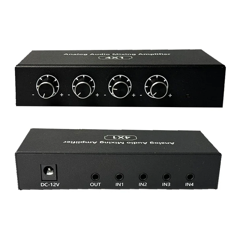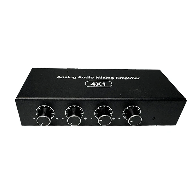 1.Mezclador estéreo que mezcla cuatro entradas de sonido en una salida estéreo.Cada potenciómetro controla el volumen de cada canal de forma independiente y el volumen no se afecta entre sí.