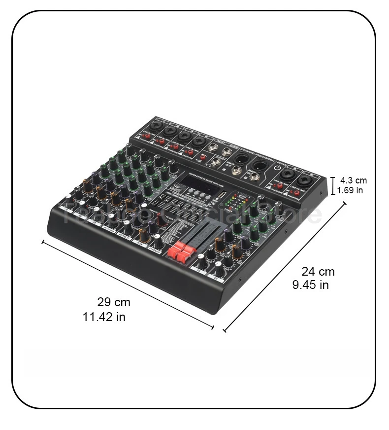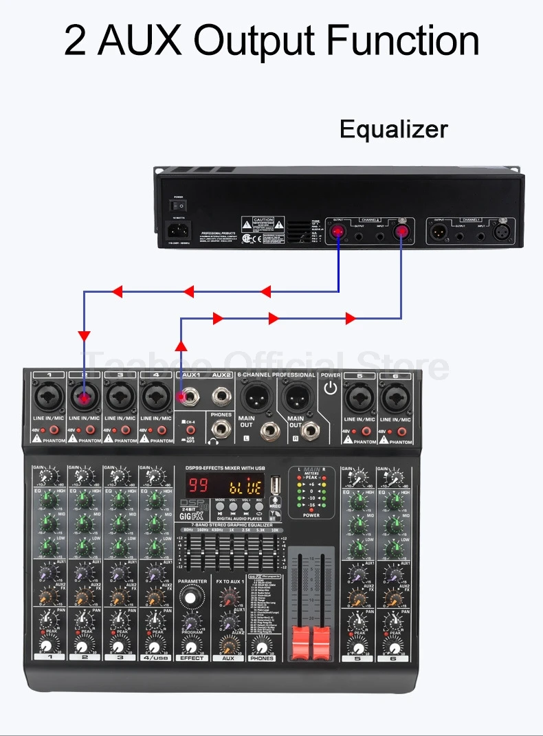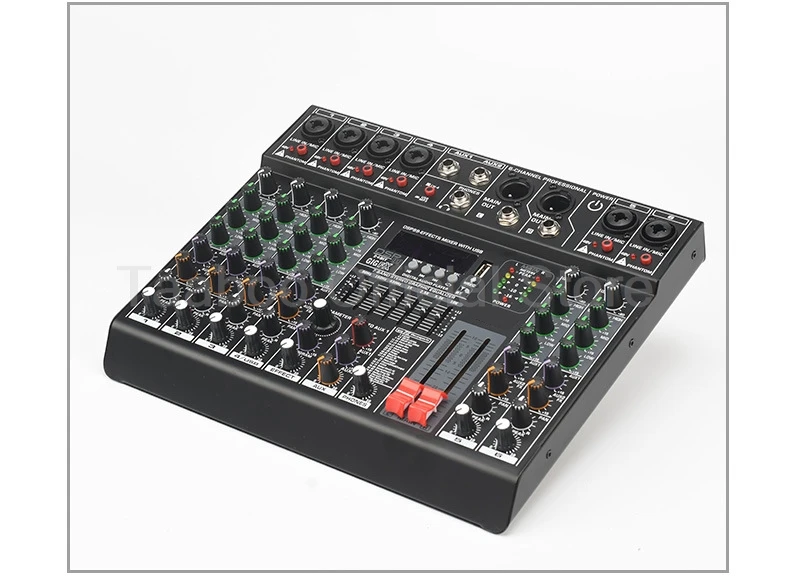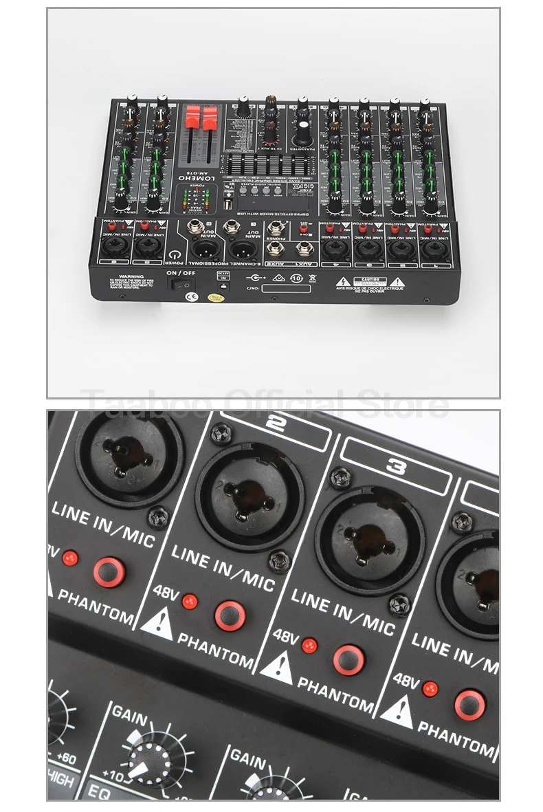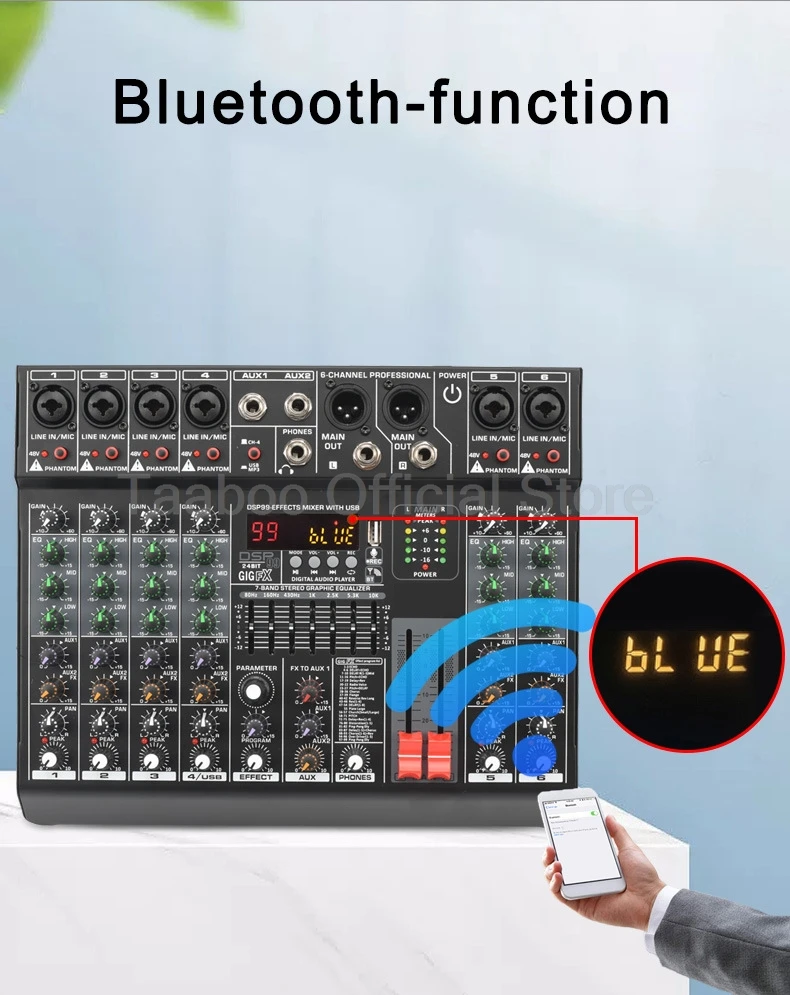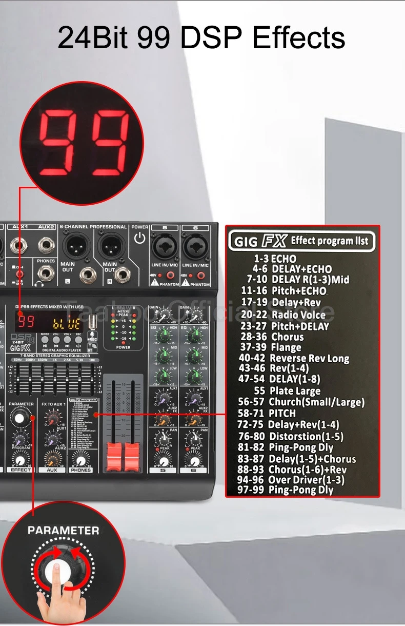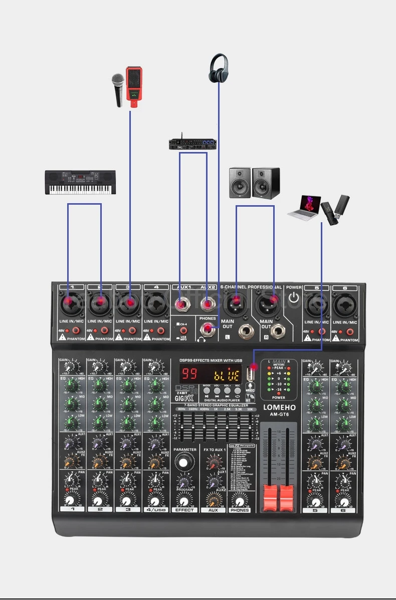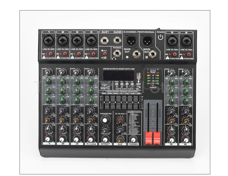 Comprar Mezclador de Audio de sonido LXT6 99 efectos, 7 bandas EQ, 6 canales con 2 salidas auxiliares, consola mezcladora, USB, grabación de PC, AUX, Bluetooth, DJ