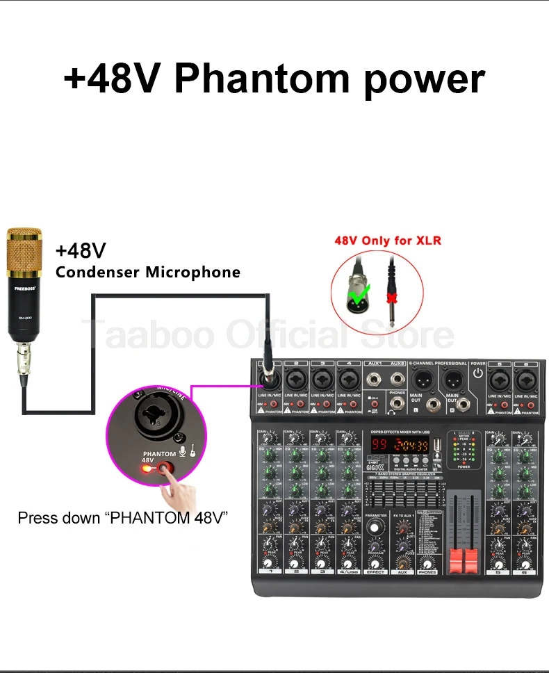 1) Después de presionar el botón "FANTOM de 48 V", la luz LED se encenderá, ahora funciona la alimentación fantasma de 48 V.