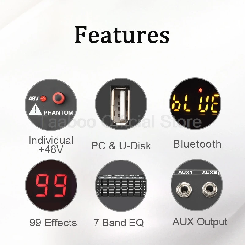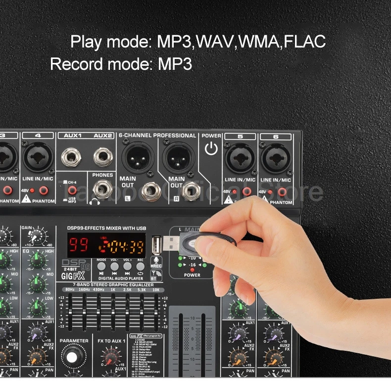 Comprar Mezclador de Audio de sonido LXT6 99 efectos, 7 bandas EQ, 6 canales con 2 salidas auxiliares, consola mezcladora, USB, grabación de PC, AUX, Bluetooth, DJ