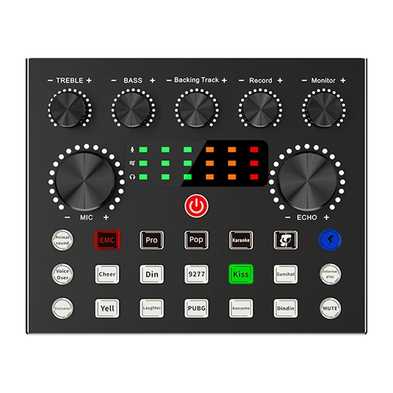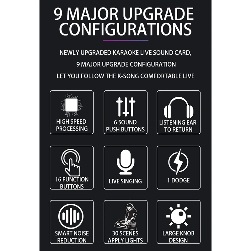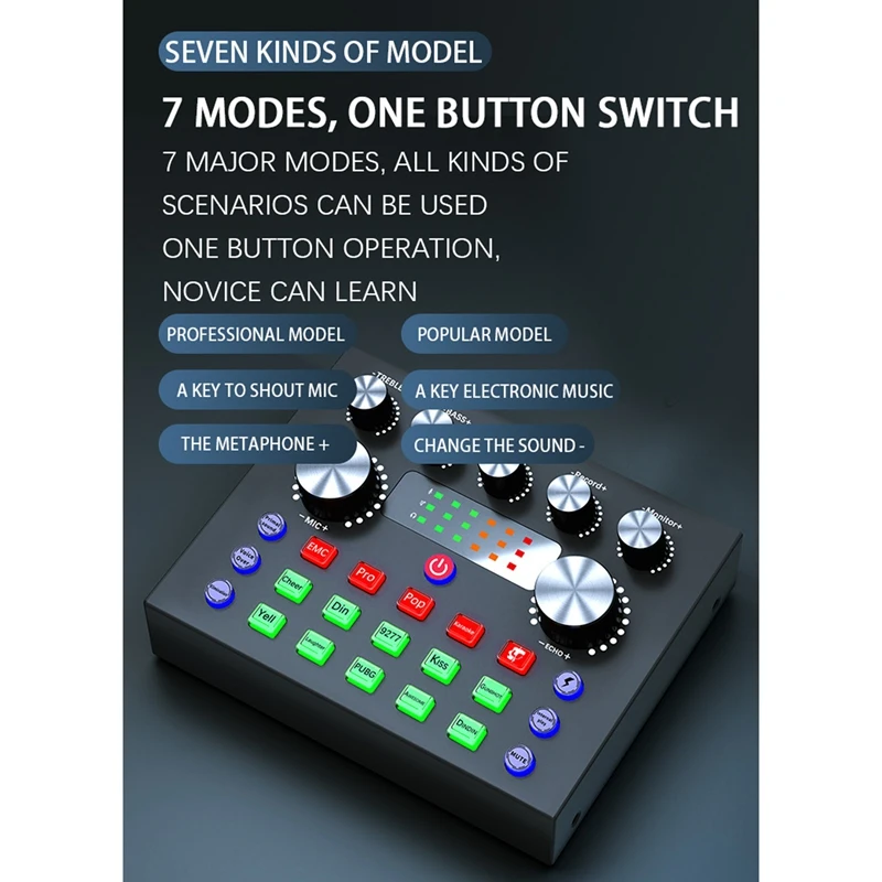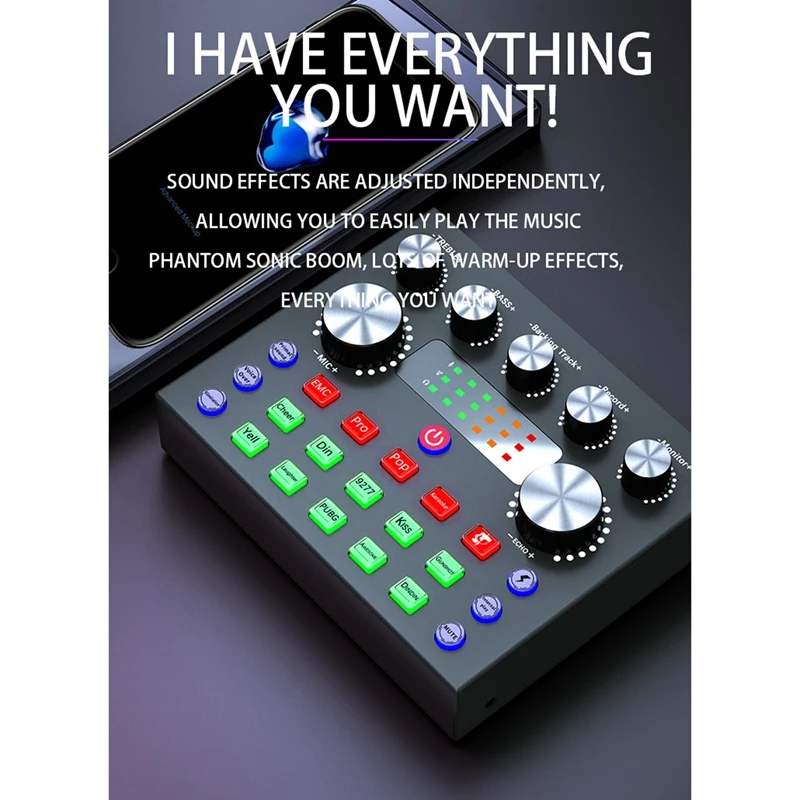 Tarjeta de sonido V8S, consola mezcladora de Audio, adaptador de Audio, equipo de transmisión en vivo, tarjeta de sonido para computadora teléfonoAdmite Entrada de acompañamiento externo: admite Entrada de acompañamiento externo, efecto de precalentamiento preestablecido integrado, efecto de sintonización automático, efecto de cambio de paso y fuerte efecto de reverberación.