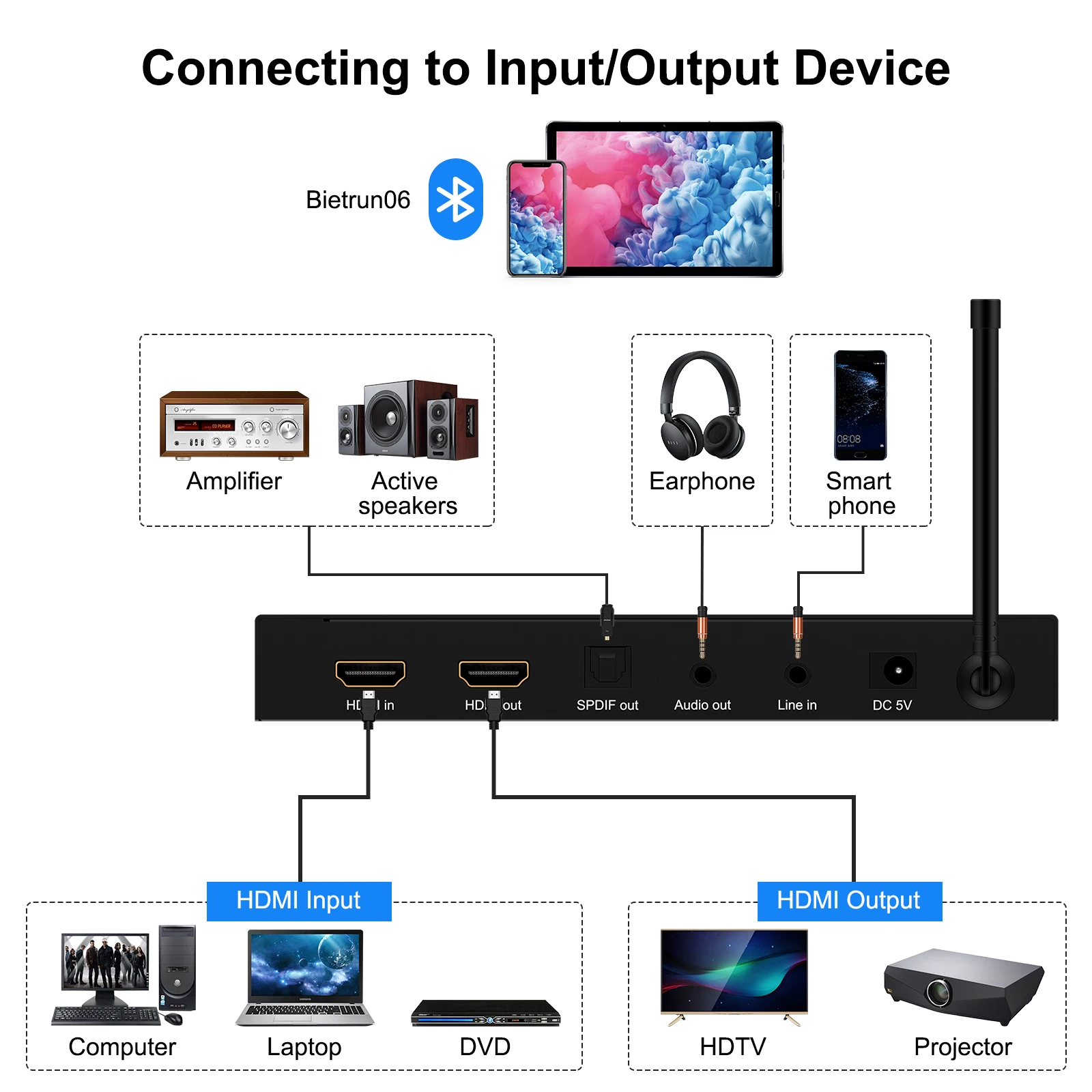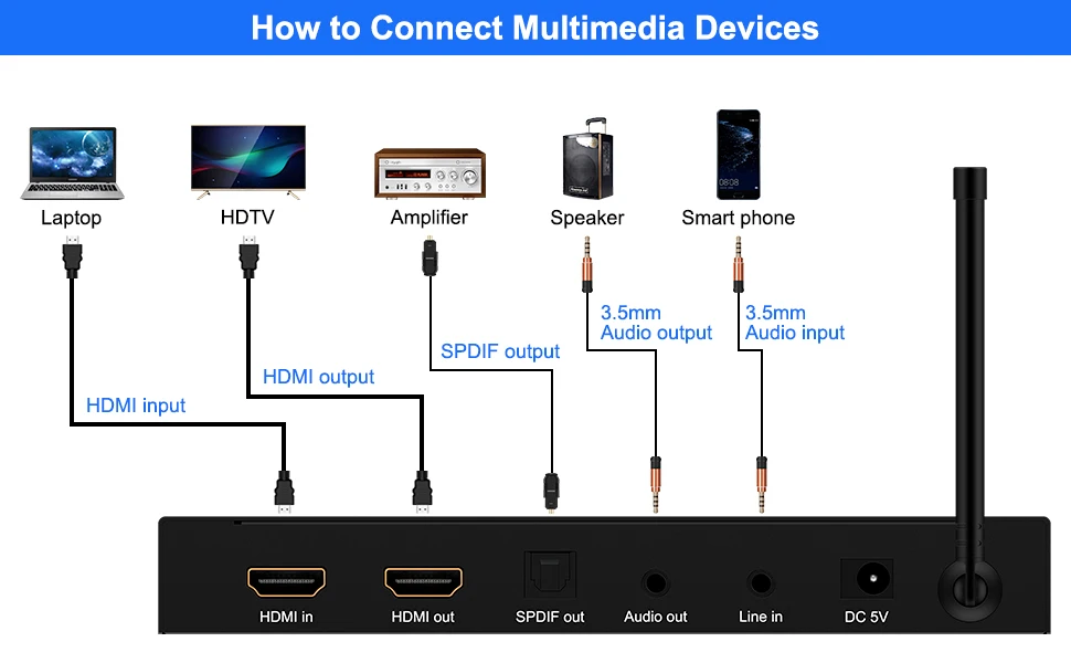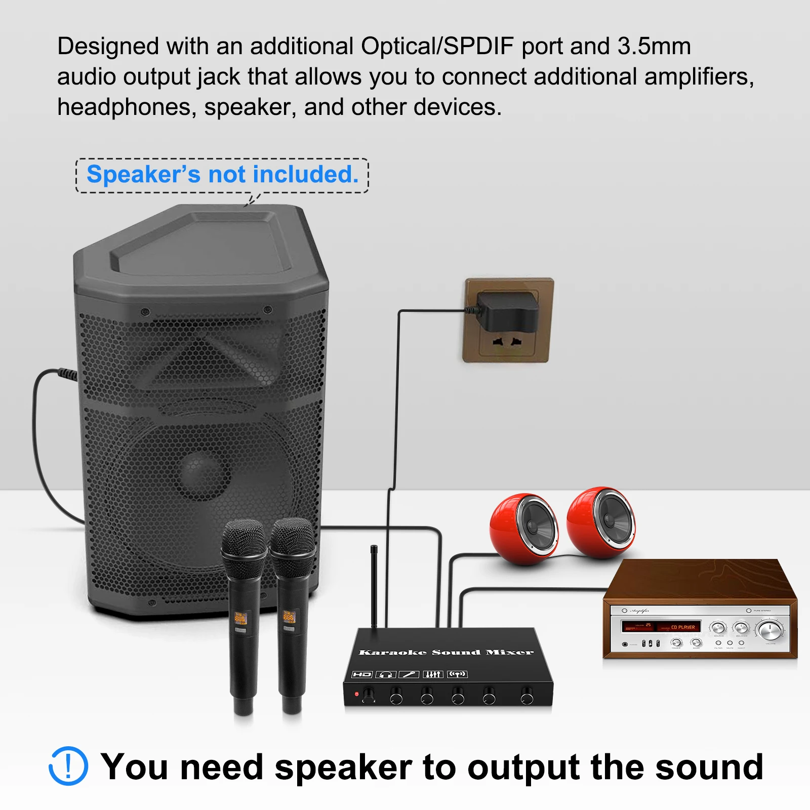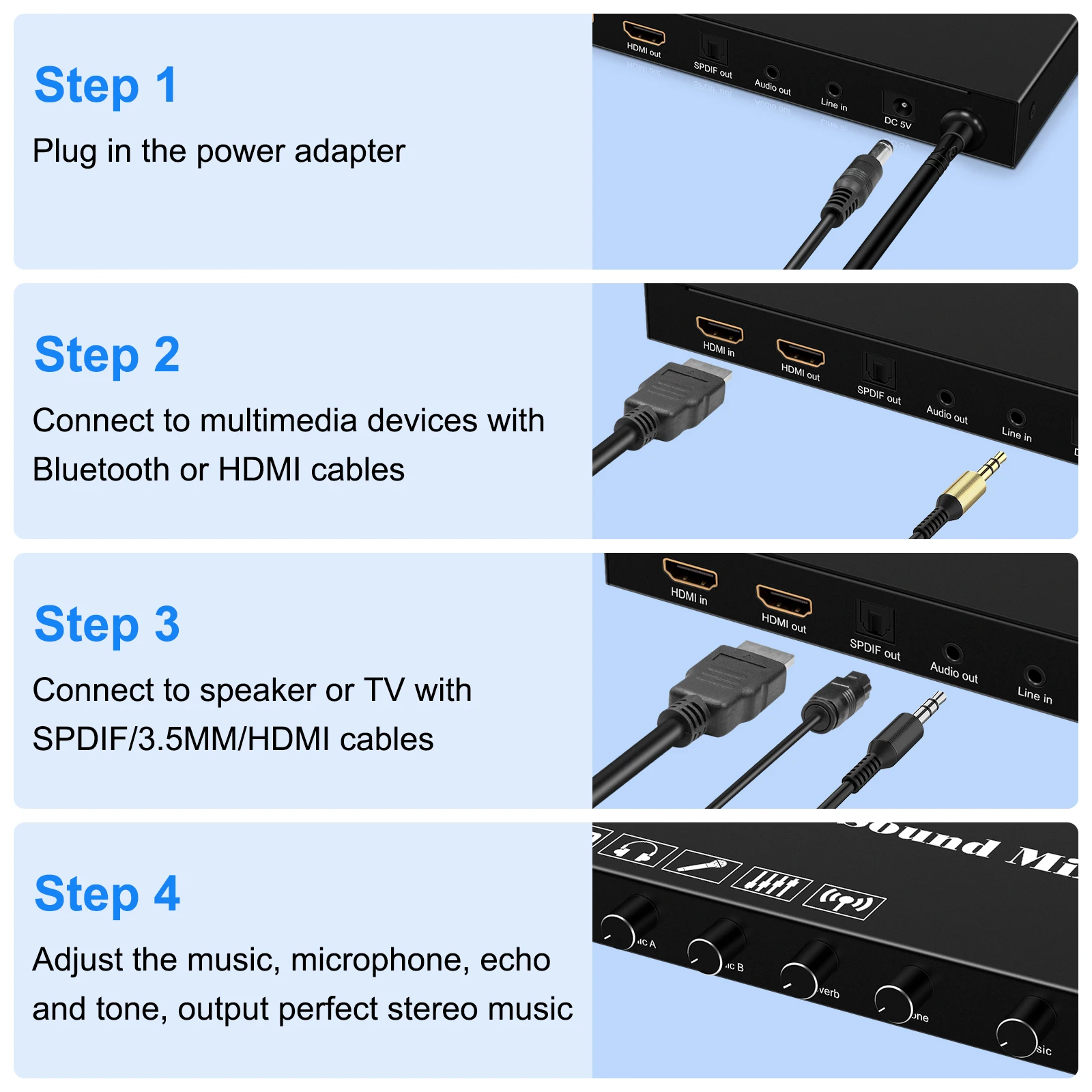 Este mezclador de sonido de karaoke con conectores HDM1/3.5 mm/Spdif facilita la conexión con varios dispositivos, incluidos TV box, smartTV, sistemas de cine en casa, receptores, parlantes, barras de sonido, amplificadores, portátiles, tabletas y más.Que está equipado con controles de ajuste giratorios, puede permitirle ajustar fácilmente la reverberación, el tono y el volumen del micrófono al nivel deseado.