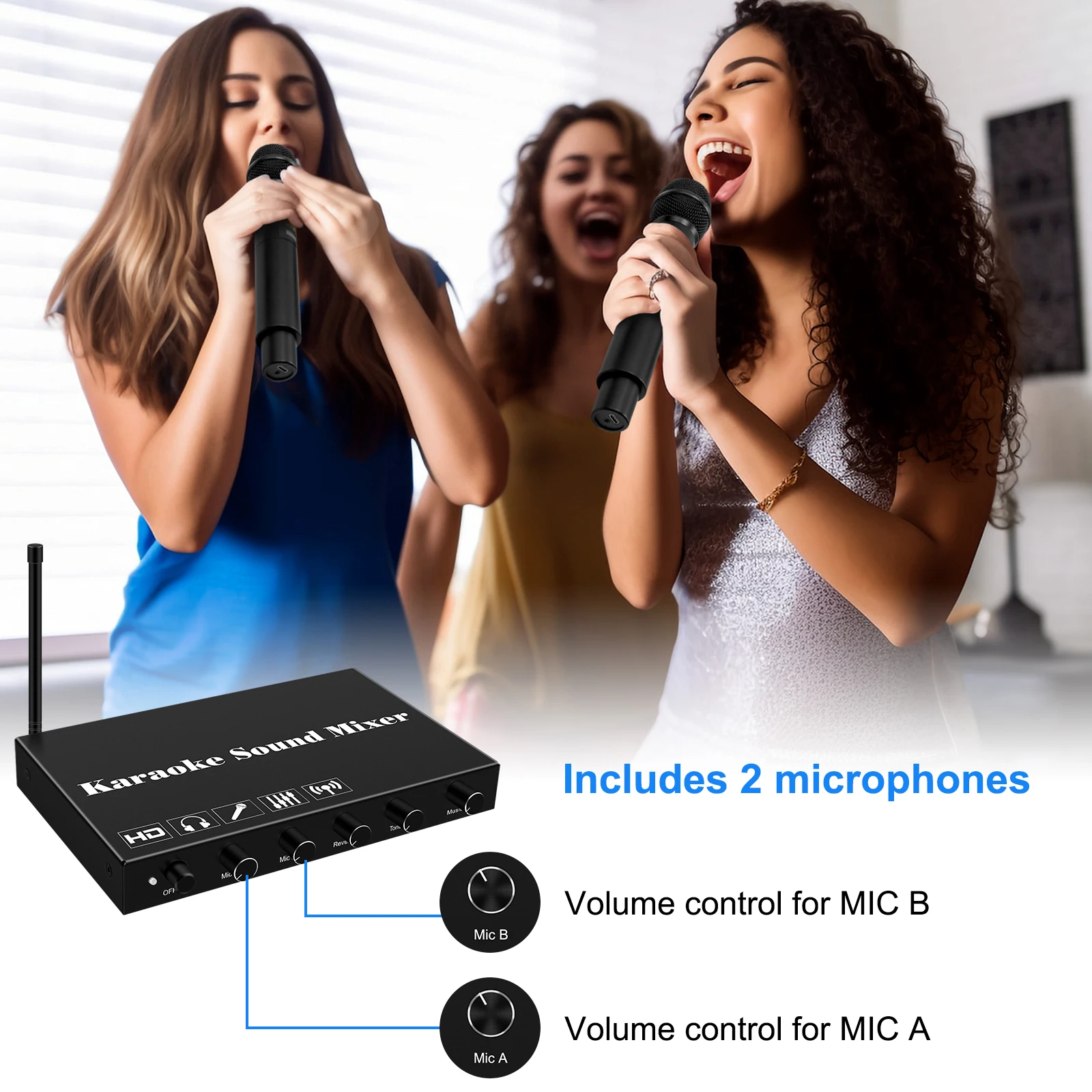Mezclador de sonido de Karaoke HDMI con micrófono inalámbrico de 2 uds, sistema mezclador de Karaoke BluetoothV5.0 con salida óptica Toslink AUX HDMI
