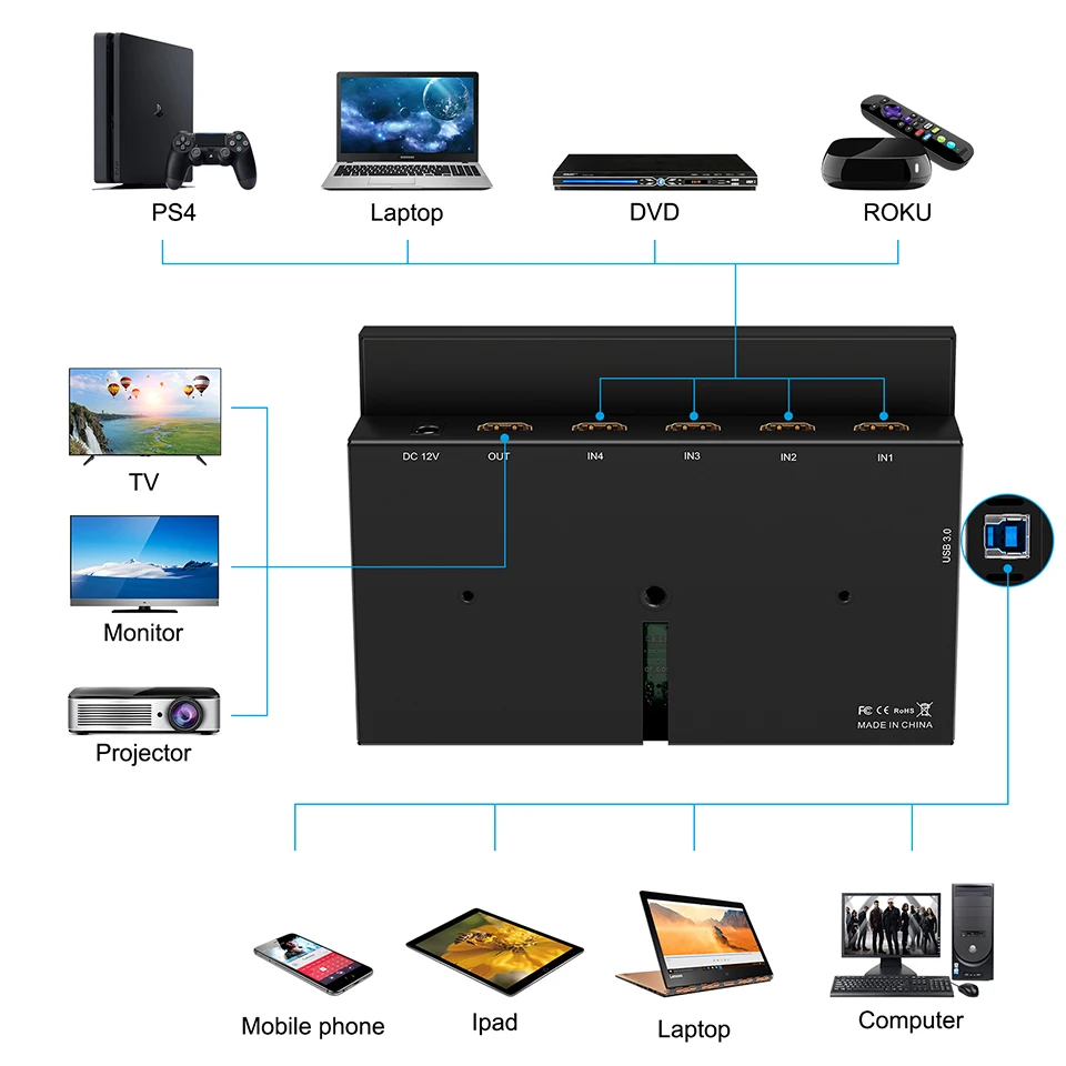 【 4 HDMI IN 1 HDMI OUT】Podemos obtener una vista previa de 4 señales HDMI y hacer fácilmente la configuración del botón. Con 1 salida en bucle HDMI, le permite agregar una pantalla local para monitoreo.