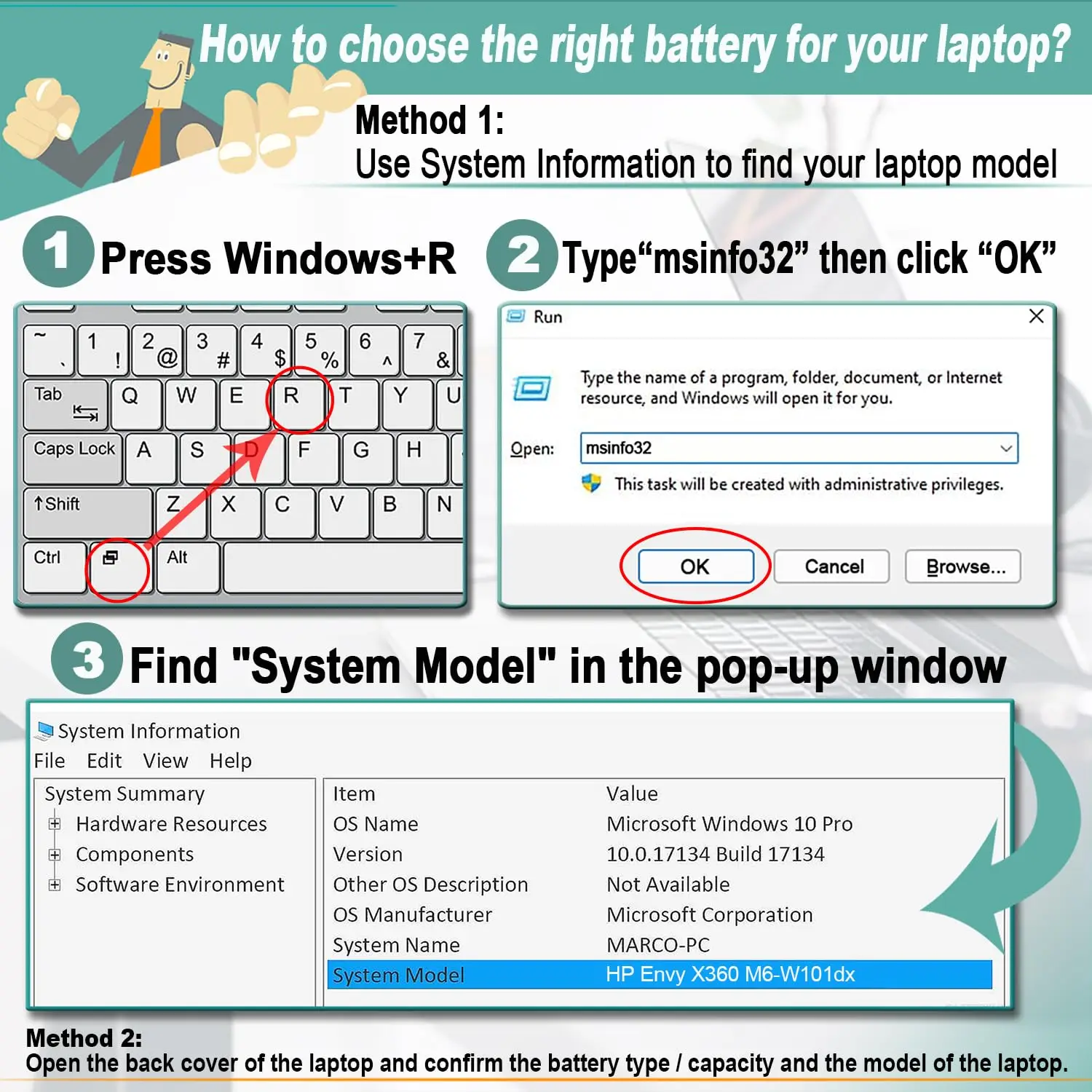 1. Abra la cubierta trasera de su ordenador portátil y compruebe el número de pieza exacto de la batería original de su ordenador portátil antes de realizar su pedido.