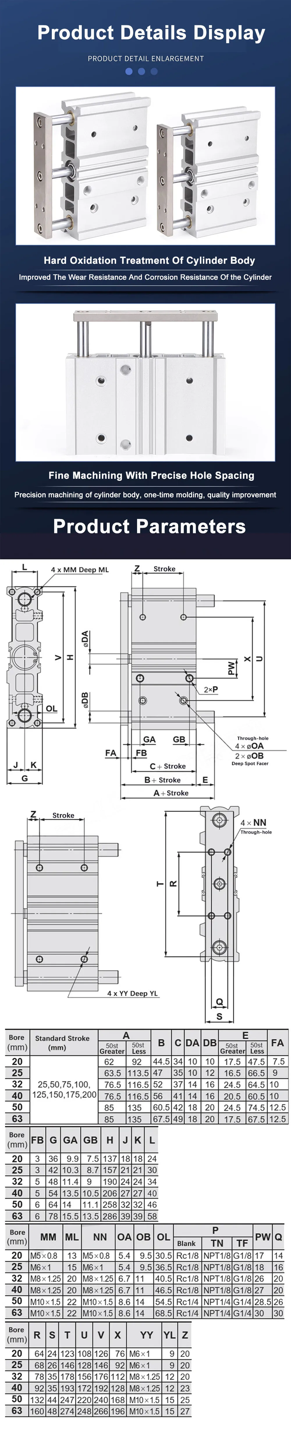 MGPWM20/25/32/40-25-50-75-100-150-200 Cilindro neumático Cilindro neumático de tres ejes de tipo ancho con varilla guía