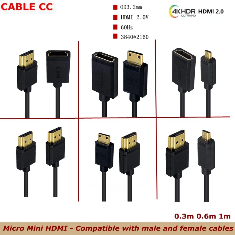 Comprar Micro Mini Hdmi 4K 60Hz, Compatible con cámara de línea ultrafina 2,0 macho a hembra, Cable de conversión de TV de pantalla plana