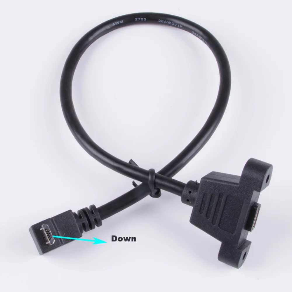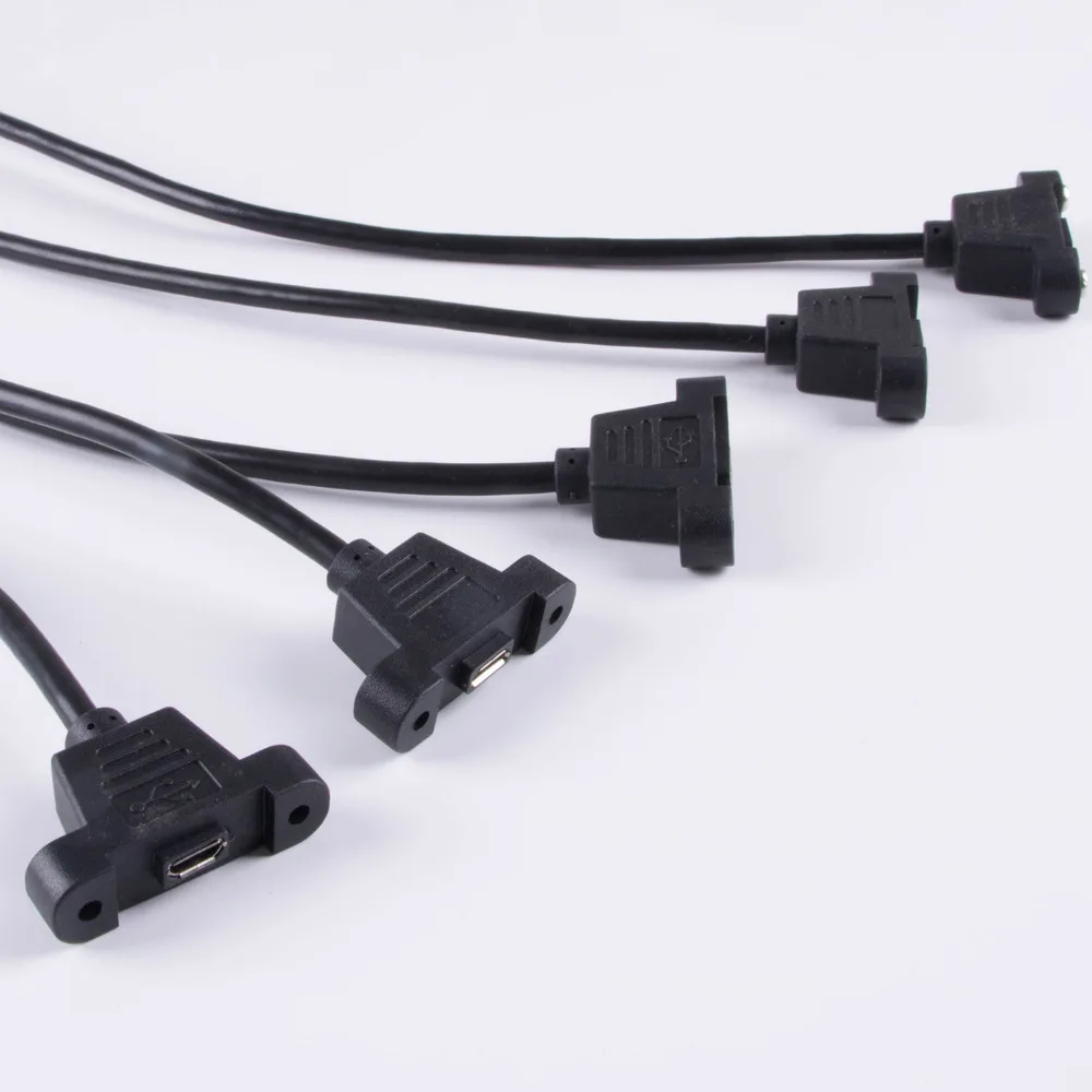 Longitud: 30cm 50cm lado A: Micro USB 2,0 5 pines macho B lado: micro USB 2,0 5 pines hembra con orificio de montaje en panel izquierdo/Derecho/arriba/abajo/ángulo recto opcional distancia del orificio: 28,5mm-29mm tipo tornillo M3 (el embalaje incluye) para carga y sincronización de datos
