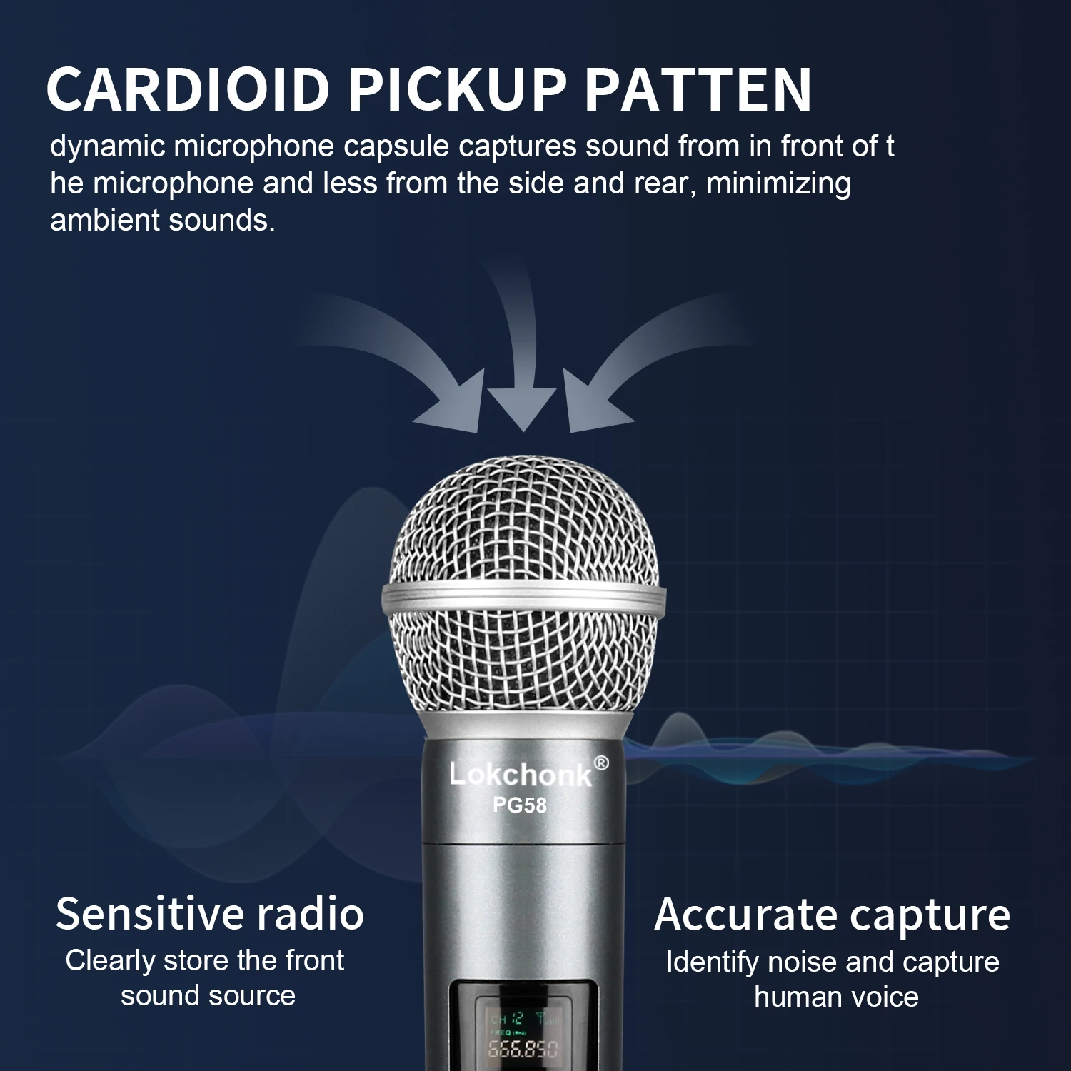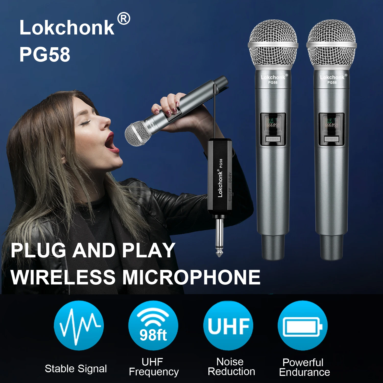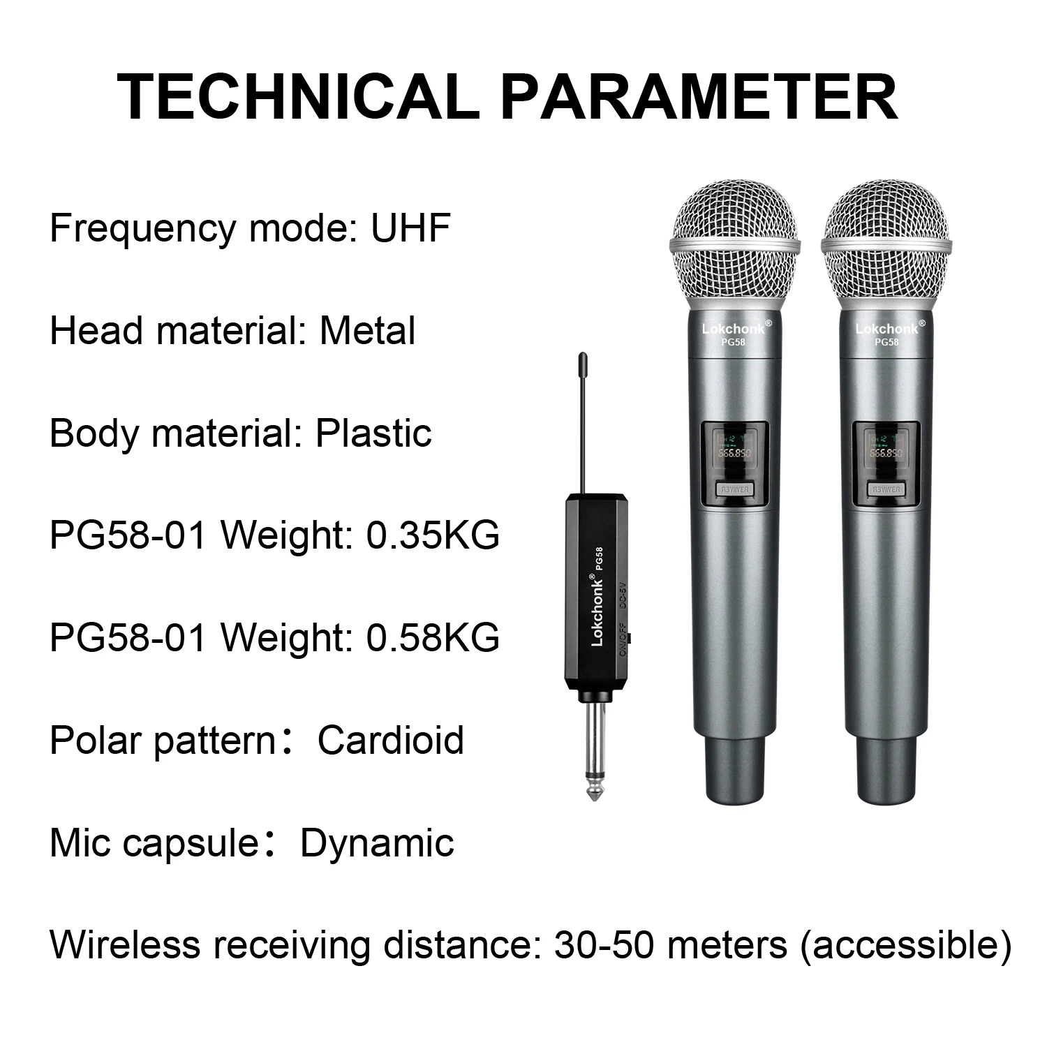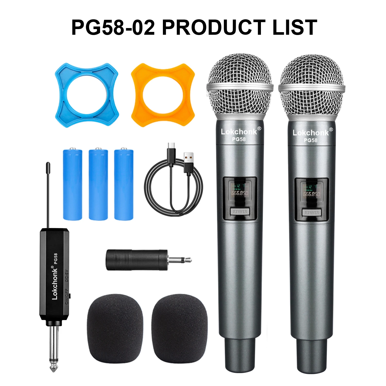 Comprar Micrófono inalámbrico PG58, accesorio de 2 canales, UHF, frecuencia fija, portátil, para fiesta, Karaoke, profesional, iglesia, espectáculo, reunión