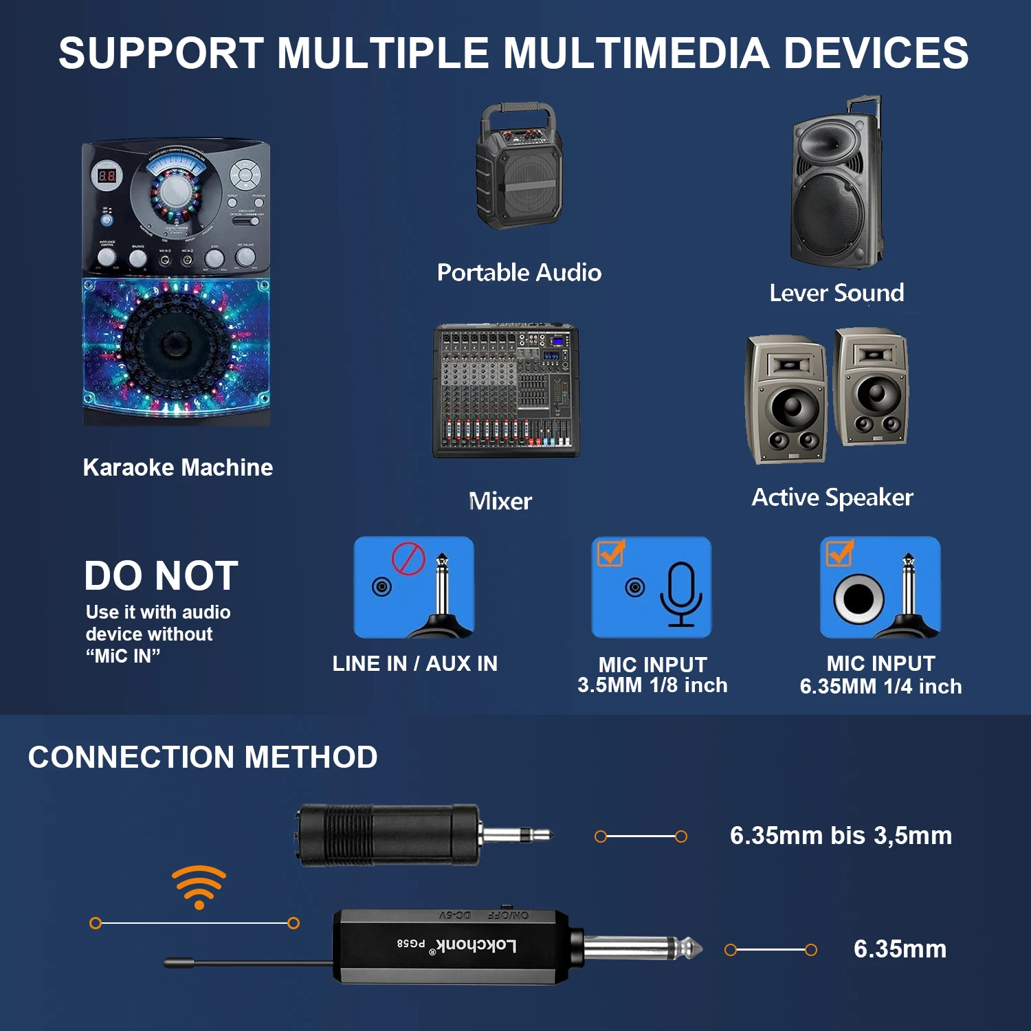 ♬[Micrófono fácil de usar]-Simplemente encienda el receptor y el micrófono inalámbrico, y coincidirán automáticamente. Micrófono inalámbrico, con convertidor TRS de 6,3mm (1/4 ") a 3,5mm (1/8") y cable de conversión TRRS de 6,3mm (1/4 ") a 3,5mm (1/8"), utilizado para altavoces con conector MIC, fonógrafo, amplificador de audio, sistema PA, amplificador de voz y más dispositivos de transmisión, Sólo conectado a MIC Jack. Nota: No es compatible con ordenadores portátiles, iPads, teléfonos móviles y receptores AV.