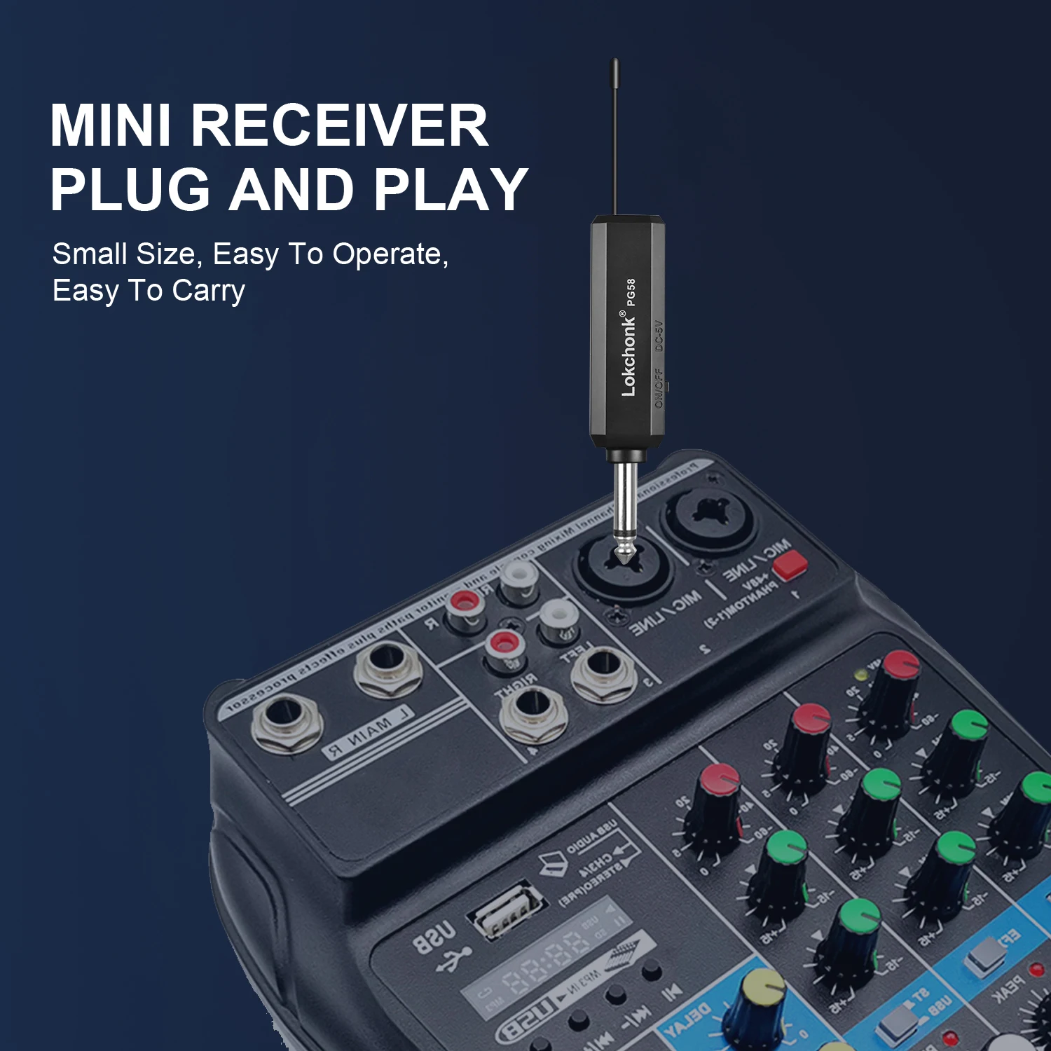 Nota:Antes de insertar el receptor, gire el volumen de entrada MIC en el altavoz o amplificador al nivel más bajo, luego encienda el micrófono, encienda el receptor, y luego lentamente subir el volumen de entrada MIC para evitar el sonido áspero del altavoz o daños en el amplificador.