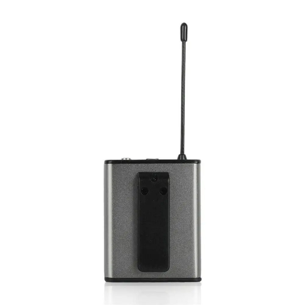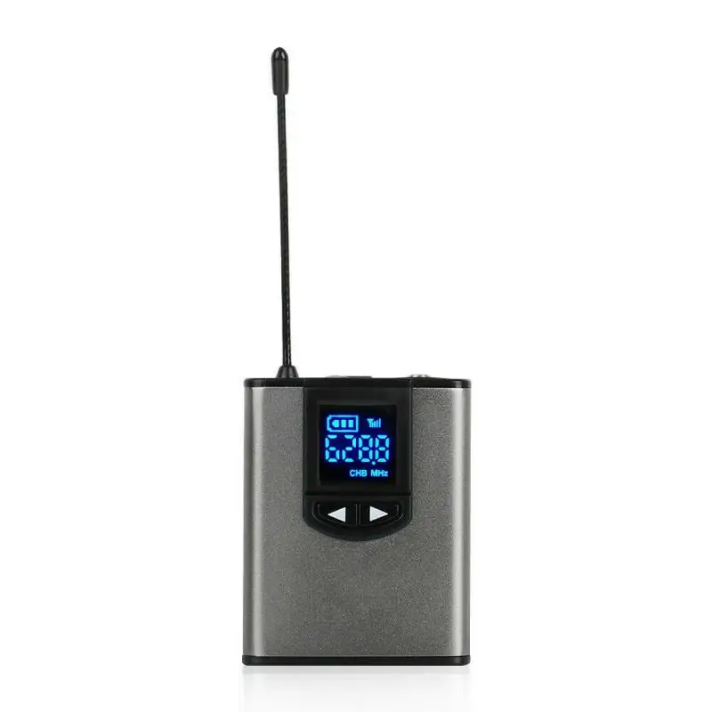 La pantalla LCD del transmisor Bodypack le muestra la frecuencia, el volumen del micrófono y el nivel de la batería.Cambiar el volumen y la frecuencia del micrófono desde el transmisor Bodypack es fácil.Tanto el transmisor Bodypack como el mini receptor portátil funcionan con baterías recargables.