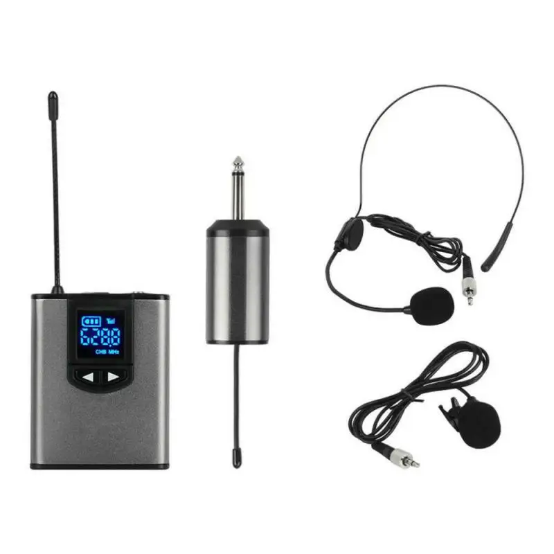 La pantalla LCD del transmisor Bodypack le muestra la frecuencia, el volumen del micrófono y el nivel de la batería.Cambiar el volumen y la frecuencia del micrófono desde el transmisor Bodypack es fácil.Tanto el transmisor Bodypack como el mini receptor portátil funcionan con baterías recargables.