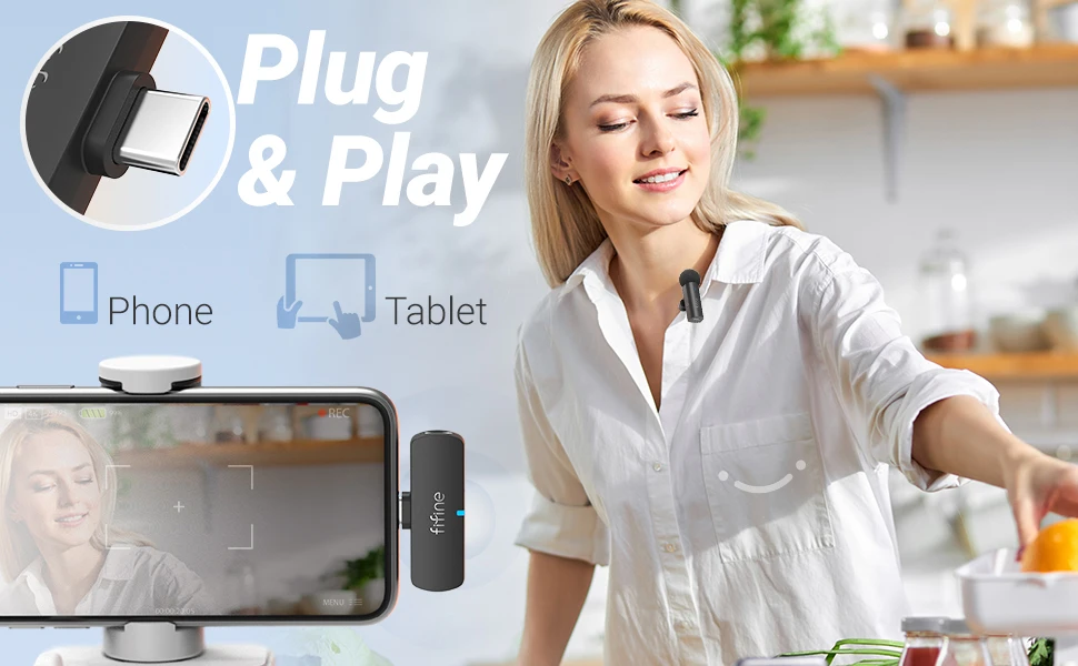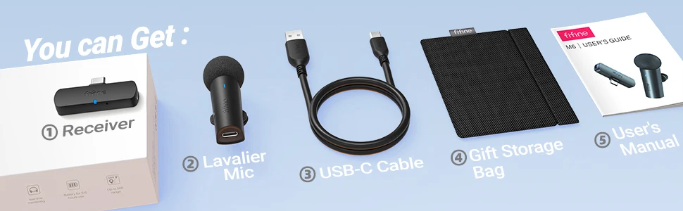 (Incluye: micrófono Lavalier inalámbrico, receptor, cable tipo C, guía del usuario)