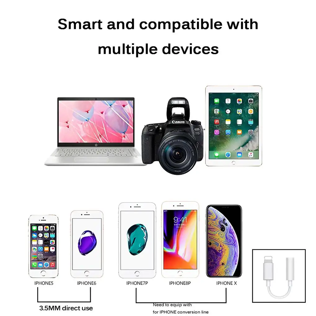Alta compatibilidad: el micrófono es compatible con una variedad de dispositivos, como teléfonos inteligentes, cámaras SLR digitales, DV de mano, computadoras portátiles, etc.