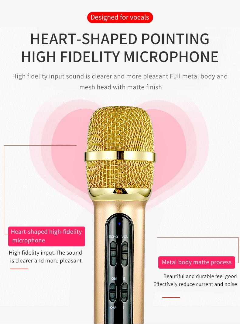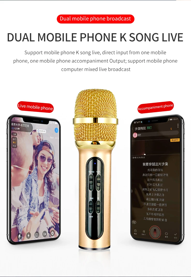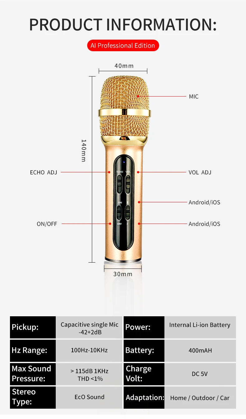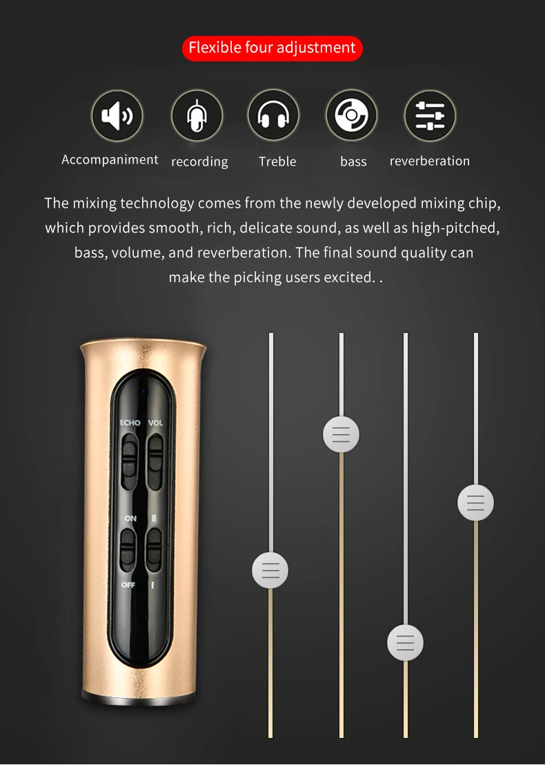* Com eco ajustar * Placa de Som incorporada, deixá-lo desfrutar de efeito KTV * soporte duplo gravação de teléfono móvil * modelo cardióide * terno para una maioria de cantar App, como smule * nenhum atraso do retorno do Fone de ouvido * COM batería de lítio, tempo de jogo Longo