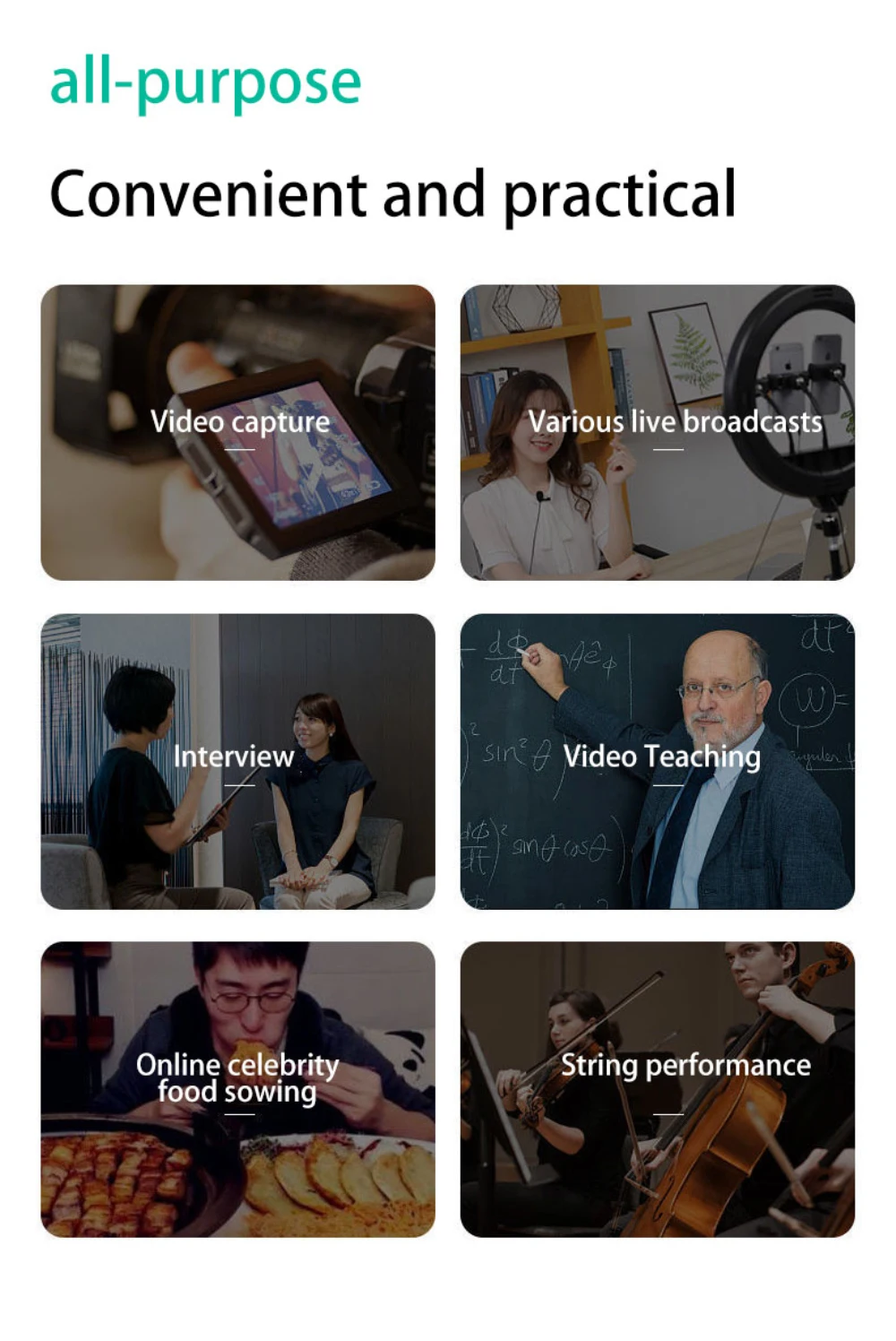 1. Micrófono de condensador de clip de cuello profesional, karaoke, video, grabación, conferencia, transmisión en vivo y otras escenas son aplicables, multiusos, conveniente y práctico.