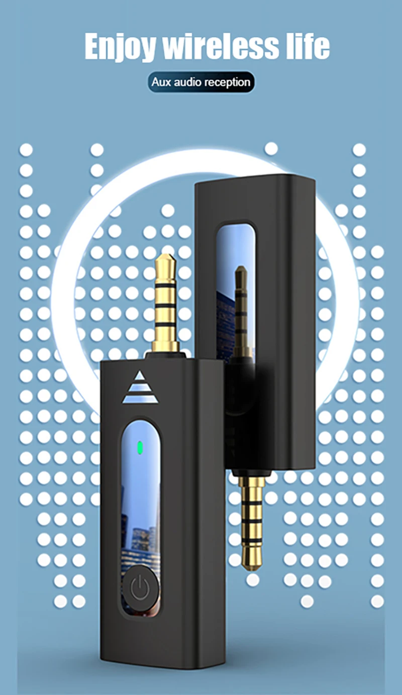 1. Primero, mantenga presionado durante 3 segundos para encender el dispositivo e inserte el cabezal de audio del receptor en el orificio de audio del teléfono móvil o estéreo, Y la luz verde parpadea para indicar que está en el Estado que se va a conectar;