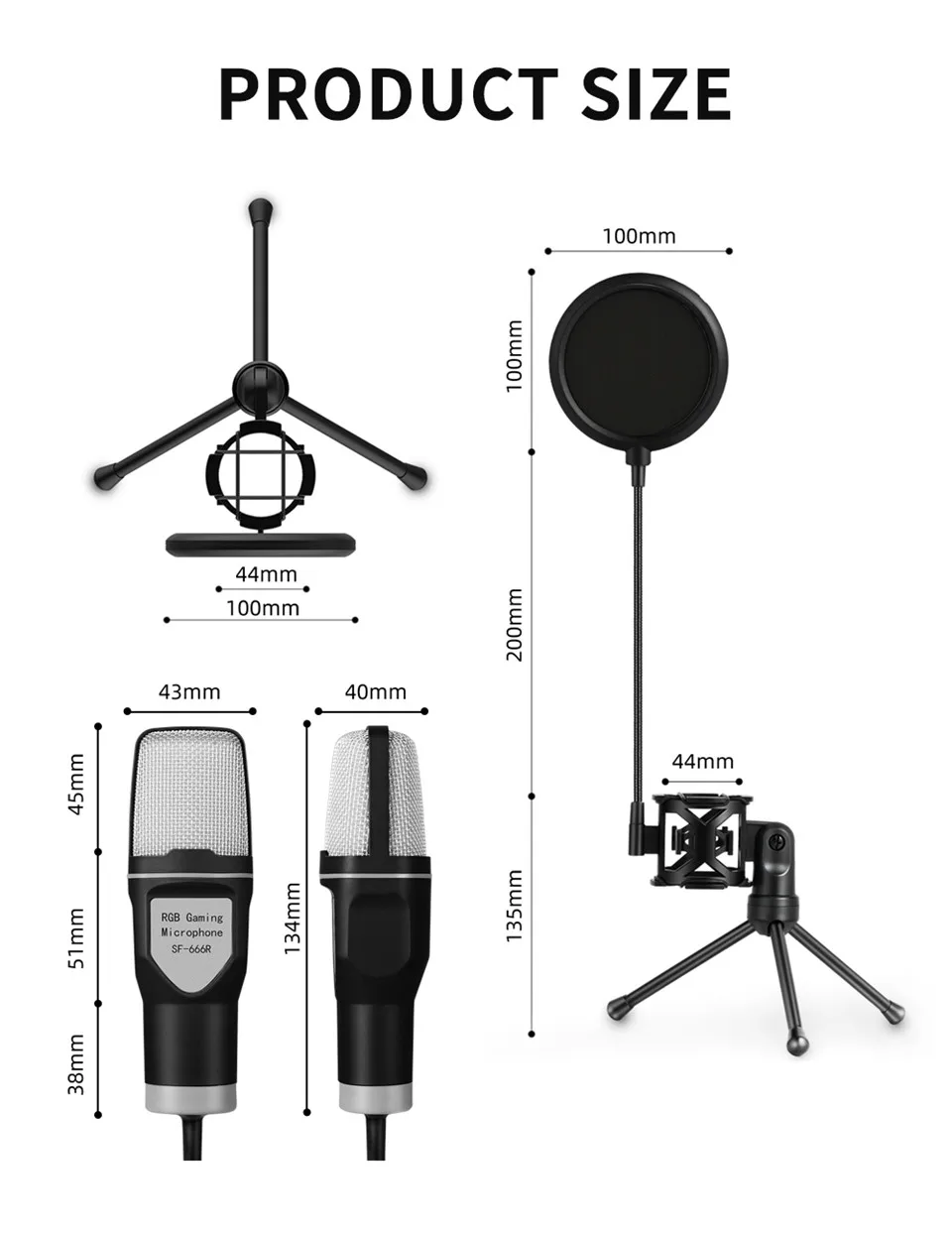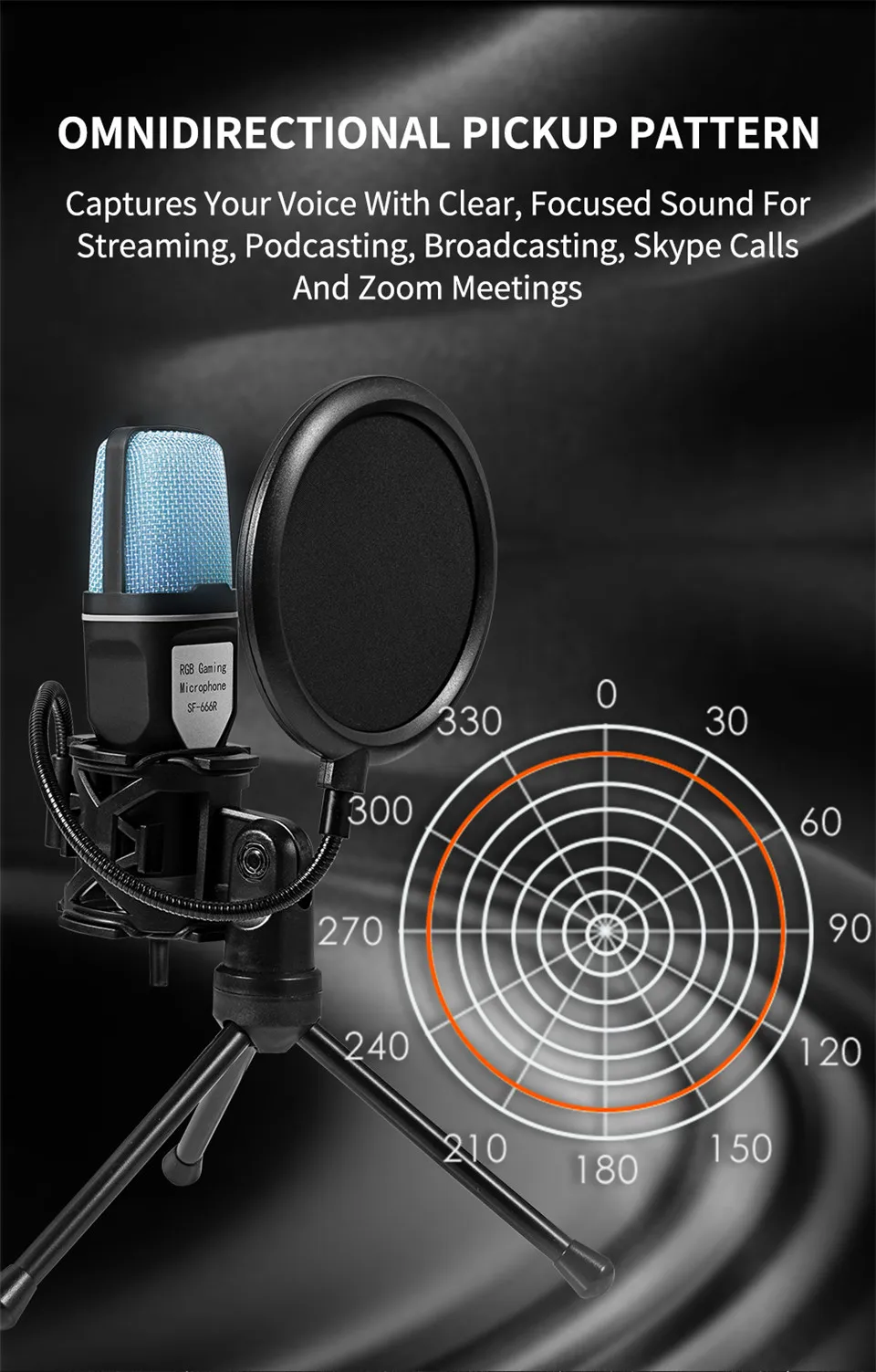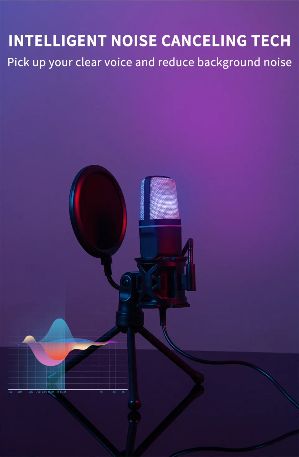 • Micrófono de condensador:El micrófono de condensador garantiza una grabación de sonido de alta calidad, lo que lo hace perfecto para podcasts, juegos y streaming.