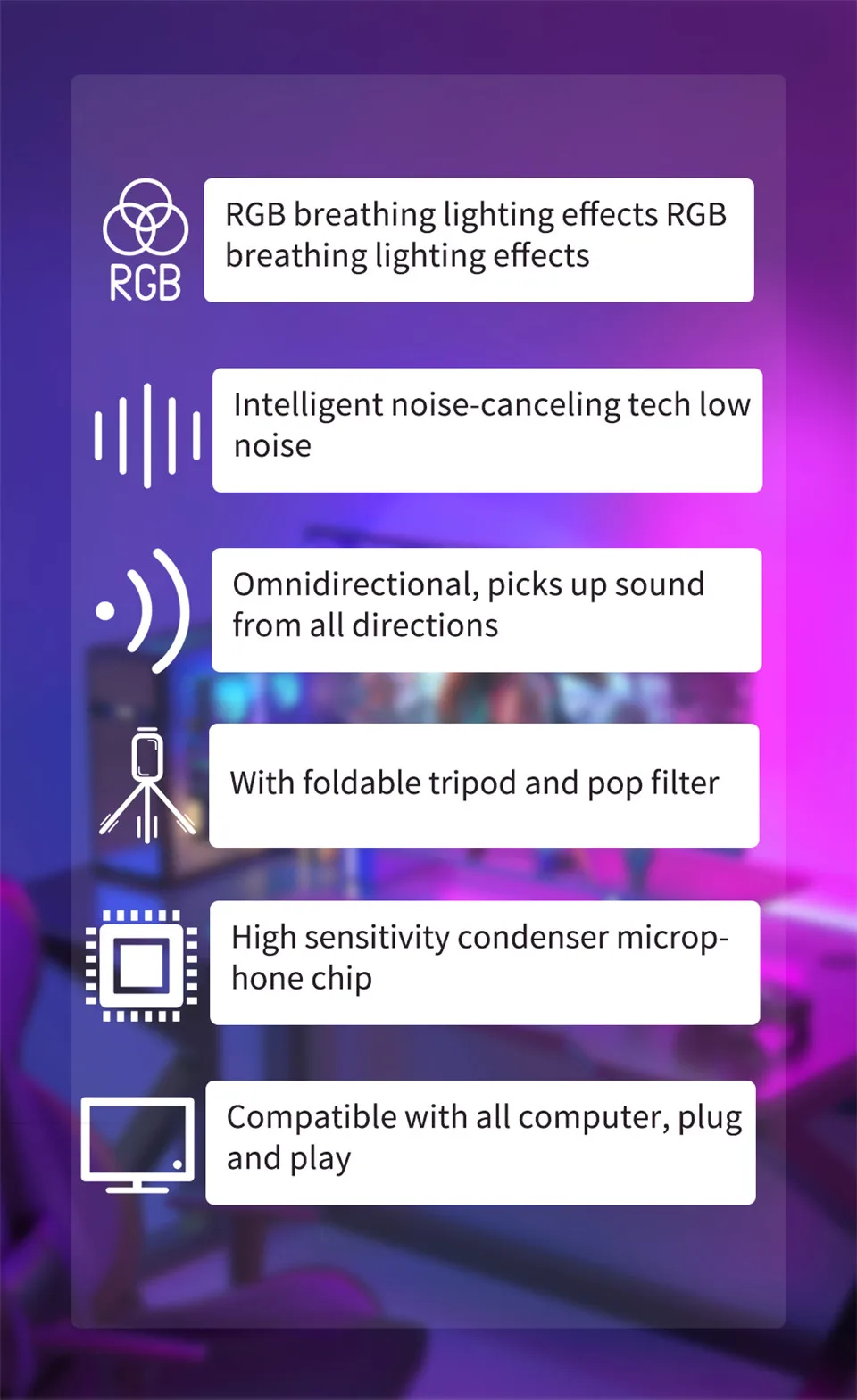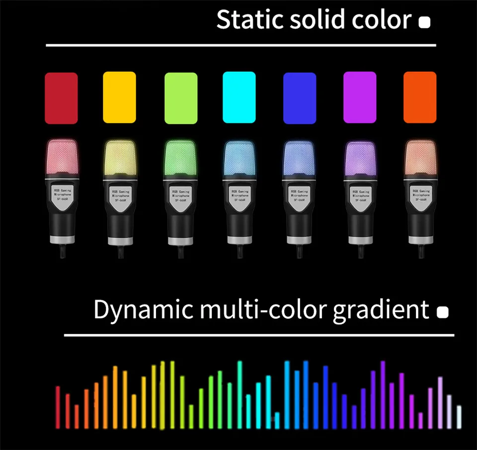 • Iluminación RGB:El micrófono viene con iluminación RGB, agregando un toque de estilo a su configuración de juegos o transmisión.