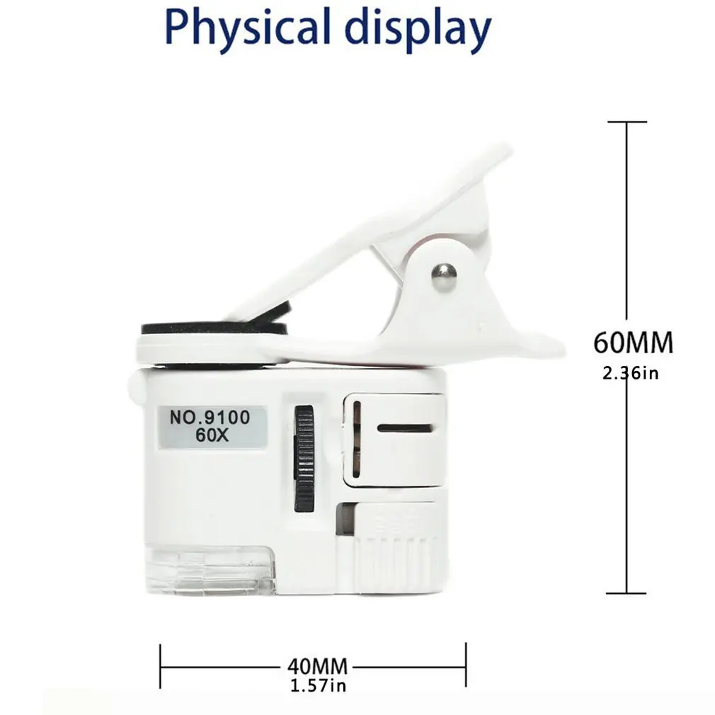 Microscopio para teléfono móvil 60/100X, instrumento LED, lupa, microscopio de bolsillo ajustado con enfoque, con Clip para teléfono móvil, luz UV