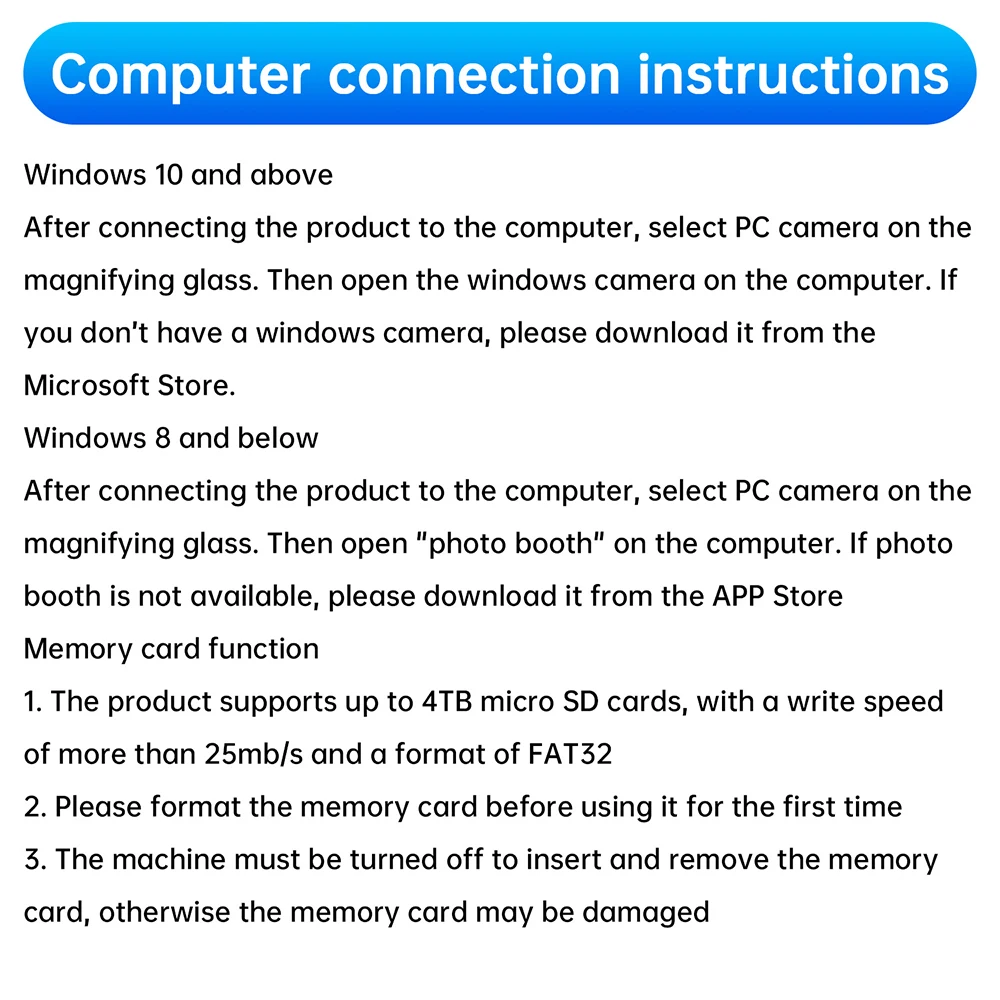 1.El producto admite tarjetas micro SD de hasta 4 TB, con una velocidad de escritura de 25 TB o más y un formato fat32