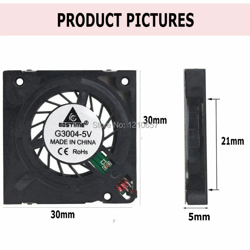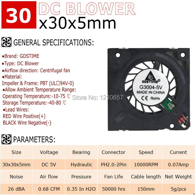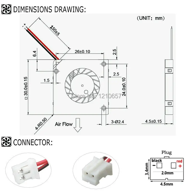 3004 especificaciones del soplador:Dimensiones: 30x30x5mm Tipo de rodamiento:Rodamiento hidráulico Conector de alimentación: PH2.0-2Pin Voltaje nominal: DC 5V Corriente nominal: 0,07± 10%Amp Velocidad nominal: 10000 ± 10% RPM Flujo de aire: 0,68cfm Nivel de ruido: 26 Vida útil del ventilador: 50000 horas Longitud del Cable: 150mm Peso neto: 5 g/unidad Aviso: para conocer los parámetros reales consulte la página de detalles del producto.