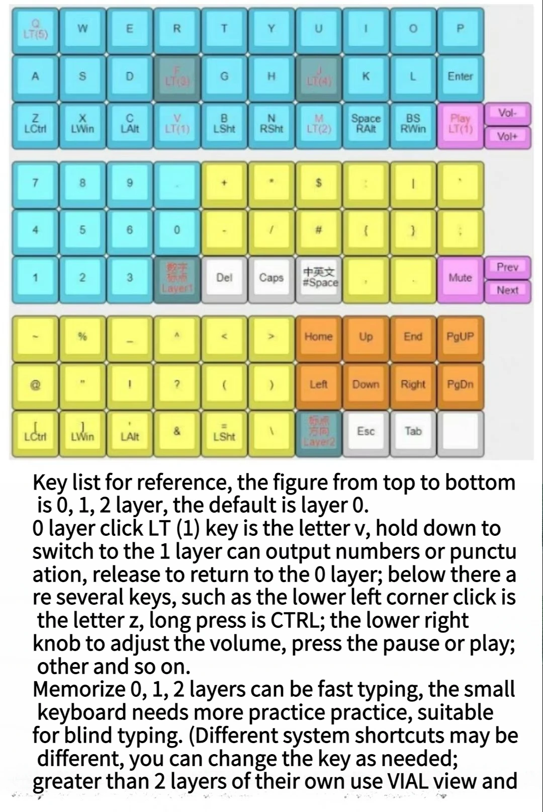 Como se muestra en la imagen, cada tecla está bien pensada y cuidadosamente diseñada, solo recuerde la capa predeterminada y los pulgares izquierdo y derecho hacia abajo cuando la capa 1, 2, la técnica de escritura es simple y clara, el teclado minimalista también puede escribir rápidamente. Oficina móvil eficiente, ocio y entretenimiento sencillos.