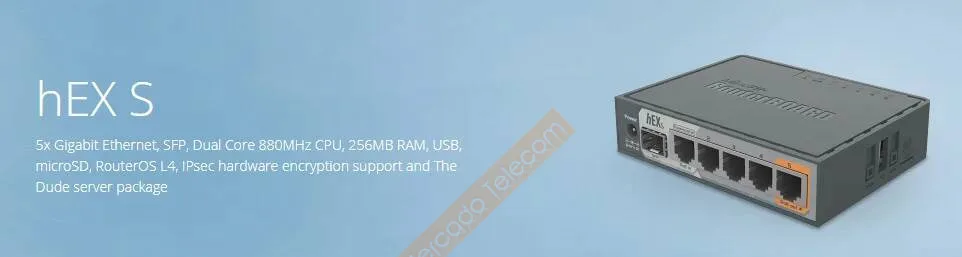 hEX S es un enrutador Gigabit Ethernet de cinco puertos para ubicaciones donde no se requiere conectividad inalámbrica.En comparación con el hEX, el hEX S también cuenta con un puerto SFP y una salida PoE en el último puerto.