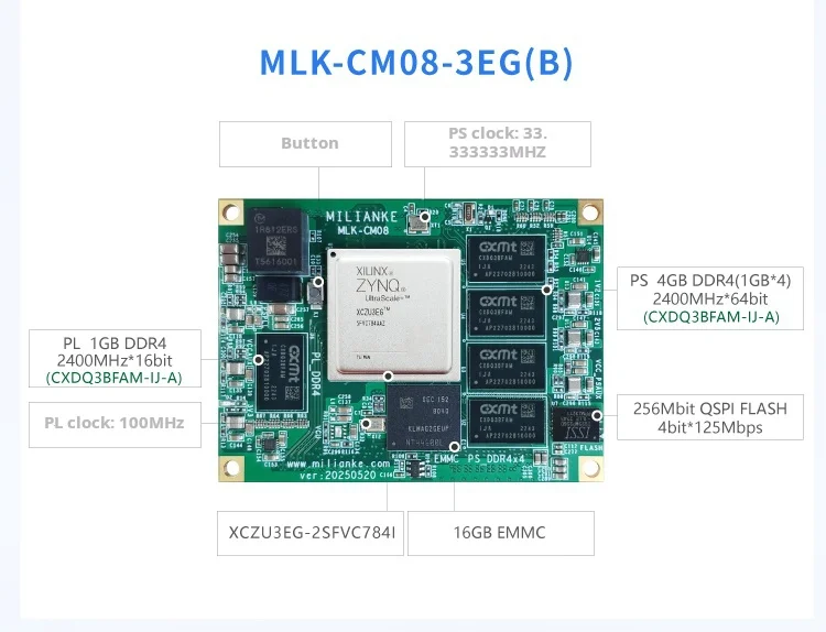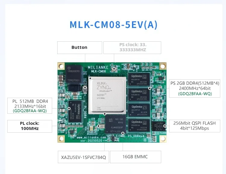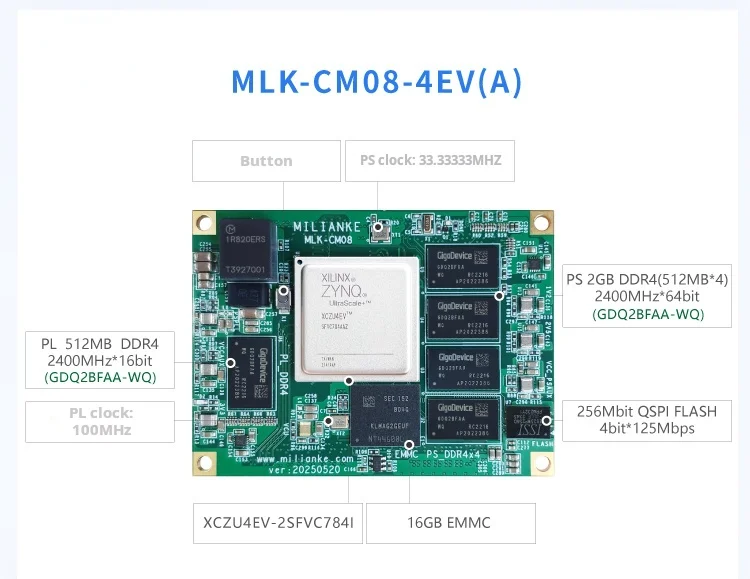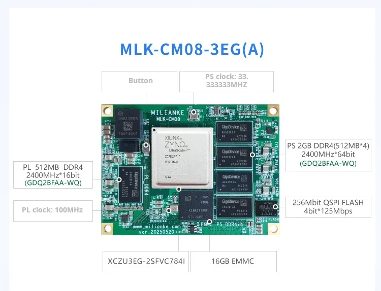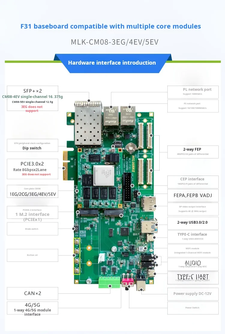 La placa admite una gama de variantes MPSoC (1EG/2CG/3EG/4EV/5EV), lo que permite a los usuarios seleccionar el equilibrio óptimo entre potencia de procesamiento, consumo de energía y costo para diferentes aplicaciones, desde el control industrial hasta la visión integrada avanzada.