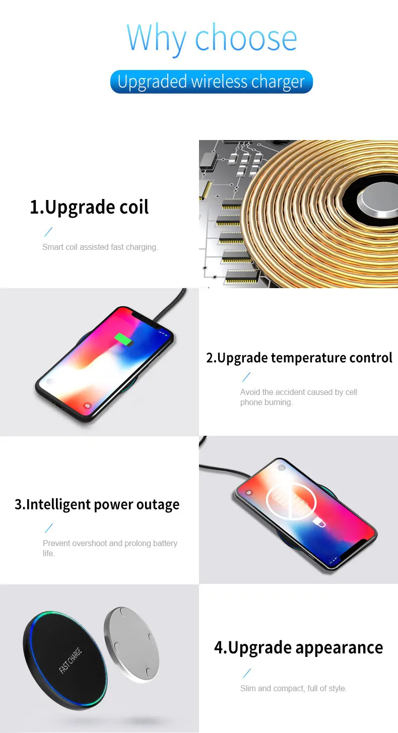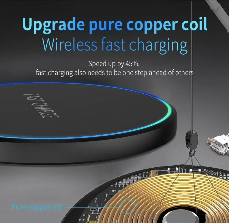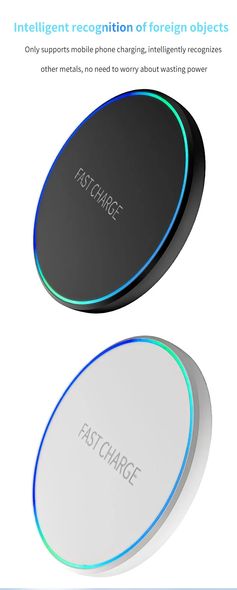 Diseño de luz indicadora inteligente- El indicador LED de la estación de carga inalámbrica rápida le ayuda a conocer el estado de carga fácilmente.El LED azul indica que su teléfono está cargando y el LED verde indica que la carga termina.Las luces cian parpadearon, lo que indica que el teléfono móvil y los auriculares se cargan normalmente.Luz suave y discreta, apta para uso junto a la cama.