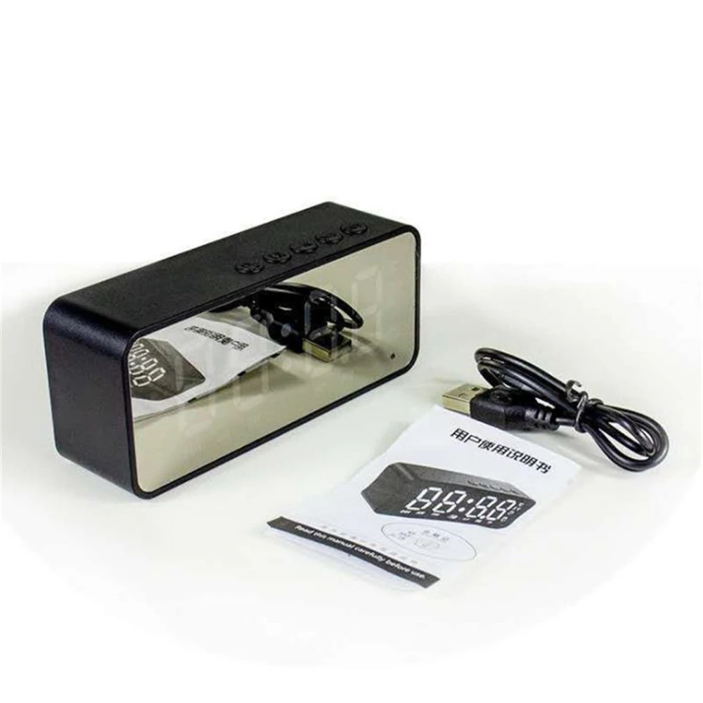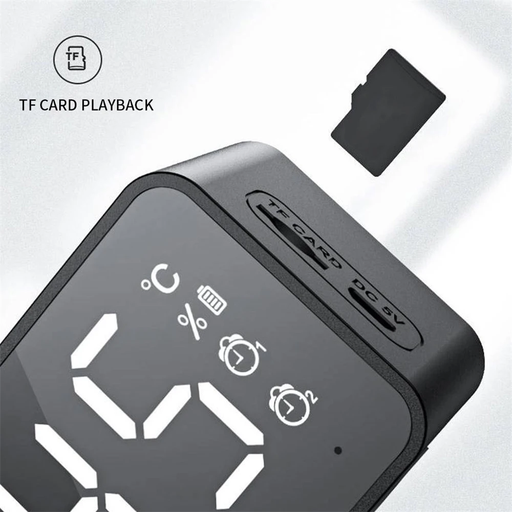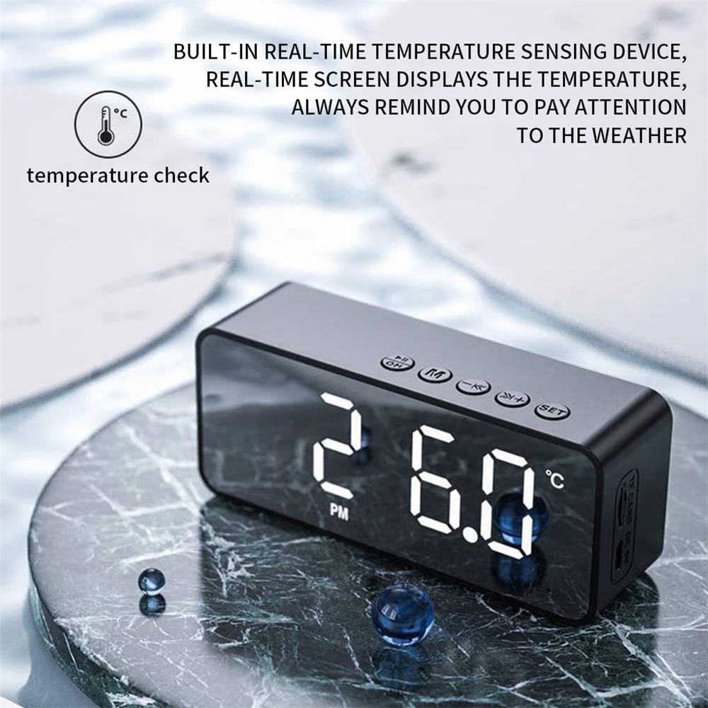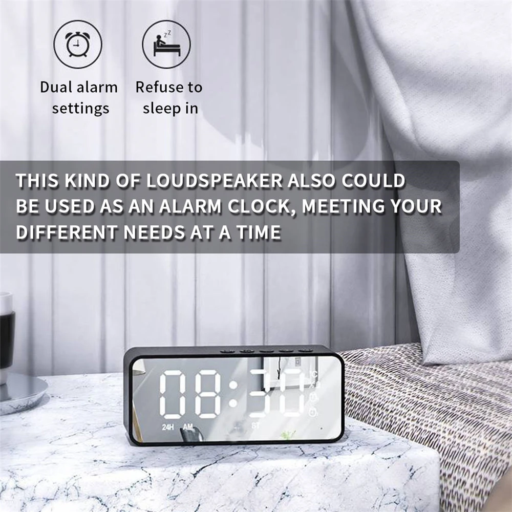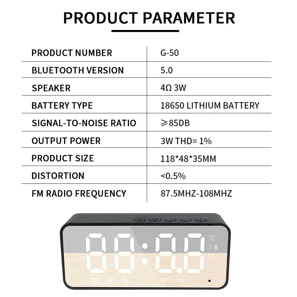 Multifunción: no solo altavoces Bluetooth, sino también relojes de alarma, radios FM, termómetros, espejos. Admite reproducción de tarjeta de enchufe de tarjeta TF, respuesta de llamadas entrantes de teléfono móvil.