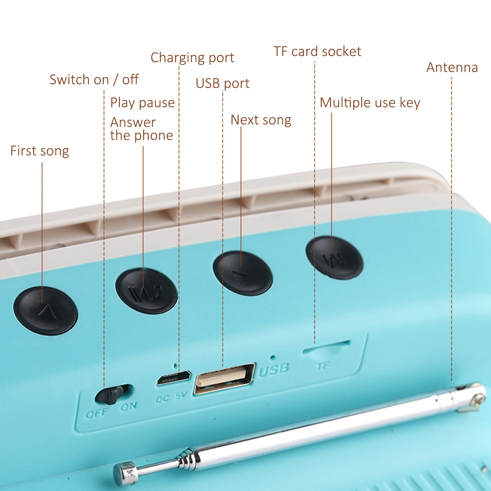 Bluetooth 5,0 está mejorado y optimizado para dispositivos de baja potencia, que pueden transmitir y ayudar al posicionamiento de manera más eficiente y aumentar la distancia de trabajo efectiva. Diseño de antena de radio, las teclas de música arriba y abajo pueden ajustar el canal de radio, altavoces de rango completo de alta fidelidad, restaurar el efecto de calidad de sonido real.