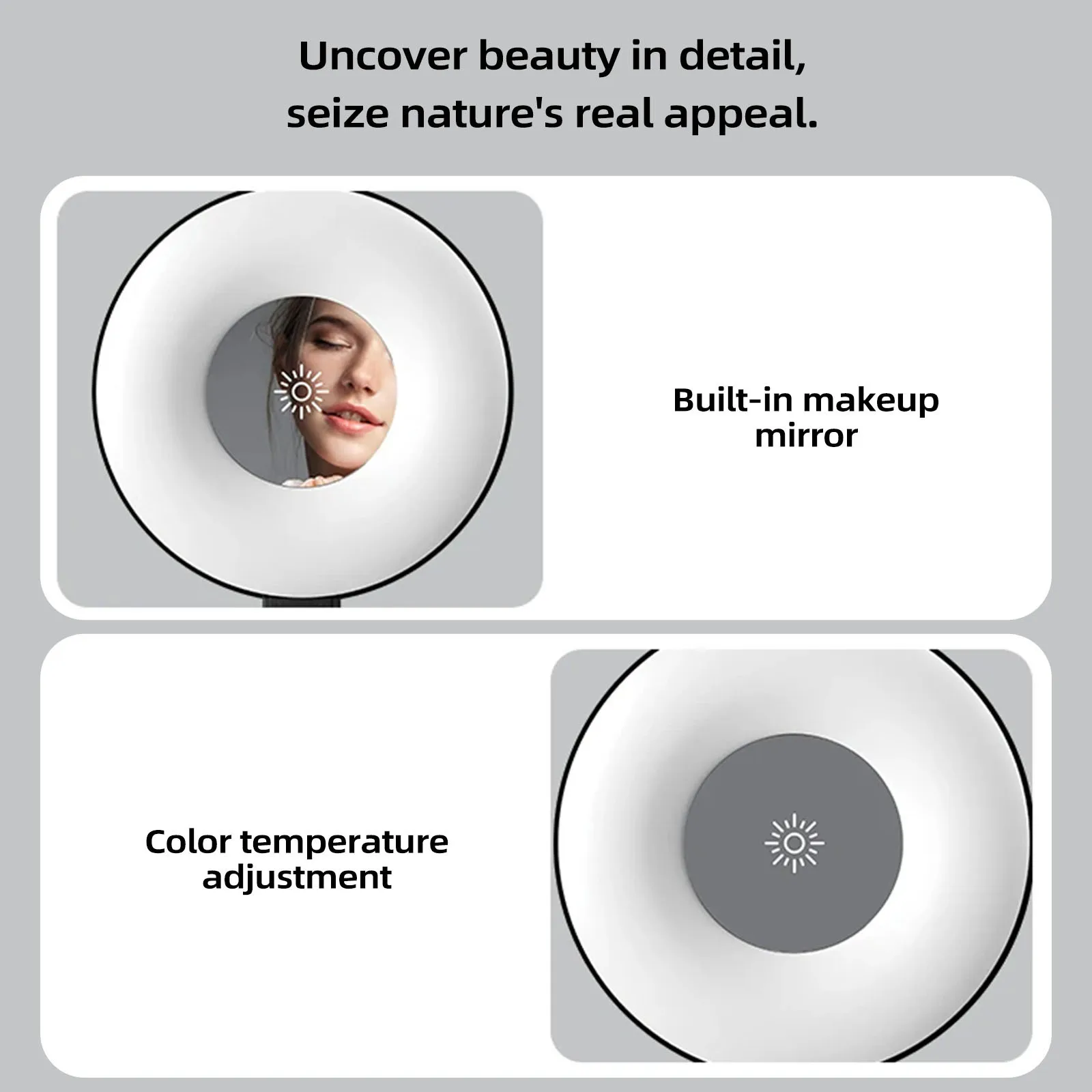 Built-in Makeup Mirror: In addition to its powerful lighting capabilities, it also comes with a built-in makeup mirror. This added feature allows you to conveniently check and touch up your makeup before taking photos, ensuring that you always look your best. With this all-in-one accessory, you can now effortlessly capture flawless selfies with better lighting and impeccable style.