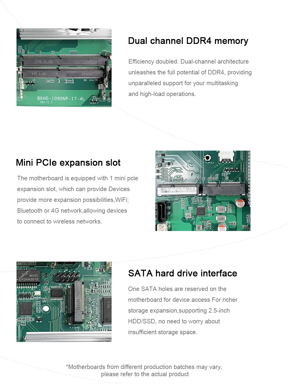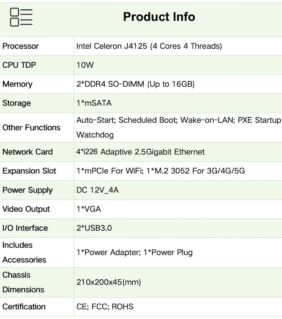 El dispositivo está equipado con un procesador Intel Celeron J4125 integrado y tiene 2 ranuras de memoria DDR4 con una capacidad de memoria máxima de 16GB.