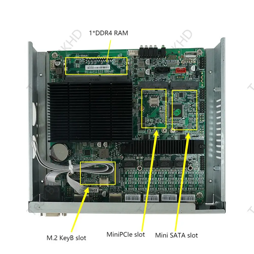 Además, tiene 1 ranura mSATA, que proporciona un amplio espacio de almacenamiento para sus datos. El dispositivo está equipado con 2 interfaces USB3.0 para proporcionar soporte para dispositivos de expansión externos. Tiene 1 ranura para tarjeta SIM y 1 Mini PCIe, y admite la adición de módulos WiFi/4G.