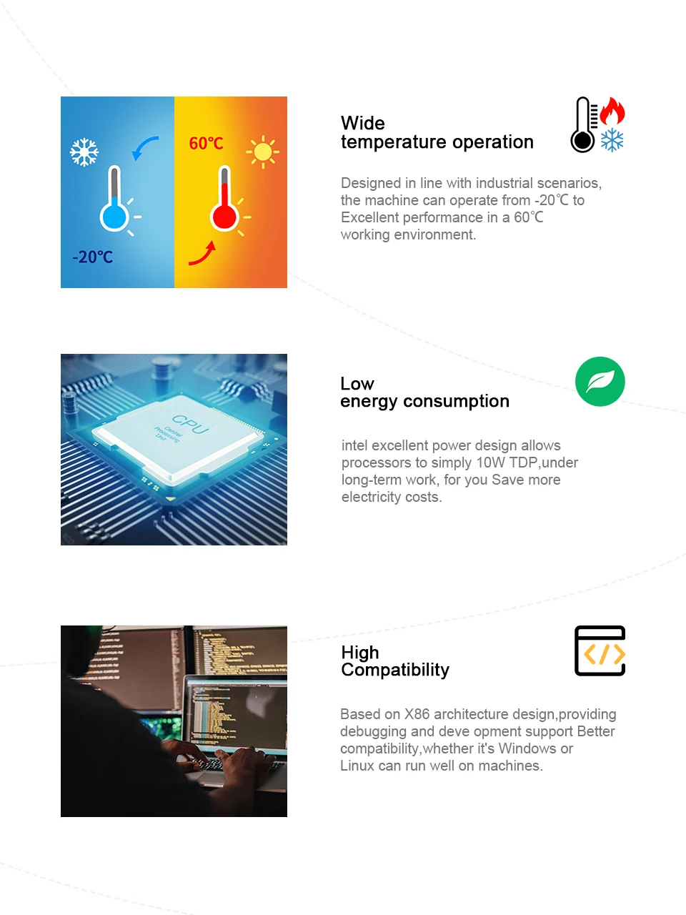 El dispositivo adopta un chasis de aleación de aluminio con un excelente rendimiento de disipación de calor. Su exquisito diseño y artesanía lo hacen adecuado para uso doméstico, comercial e industrial, y puede soportar un funcionamiento continuo del 24/7.