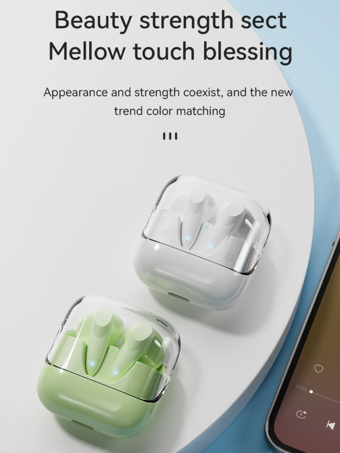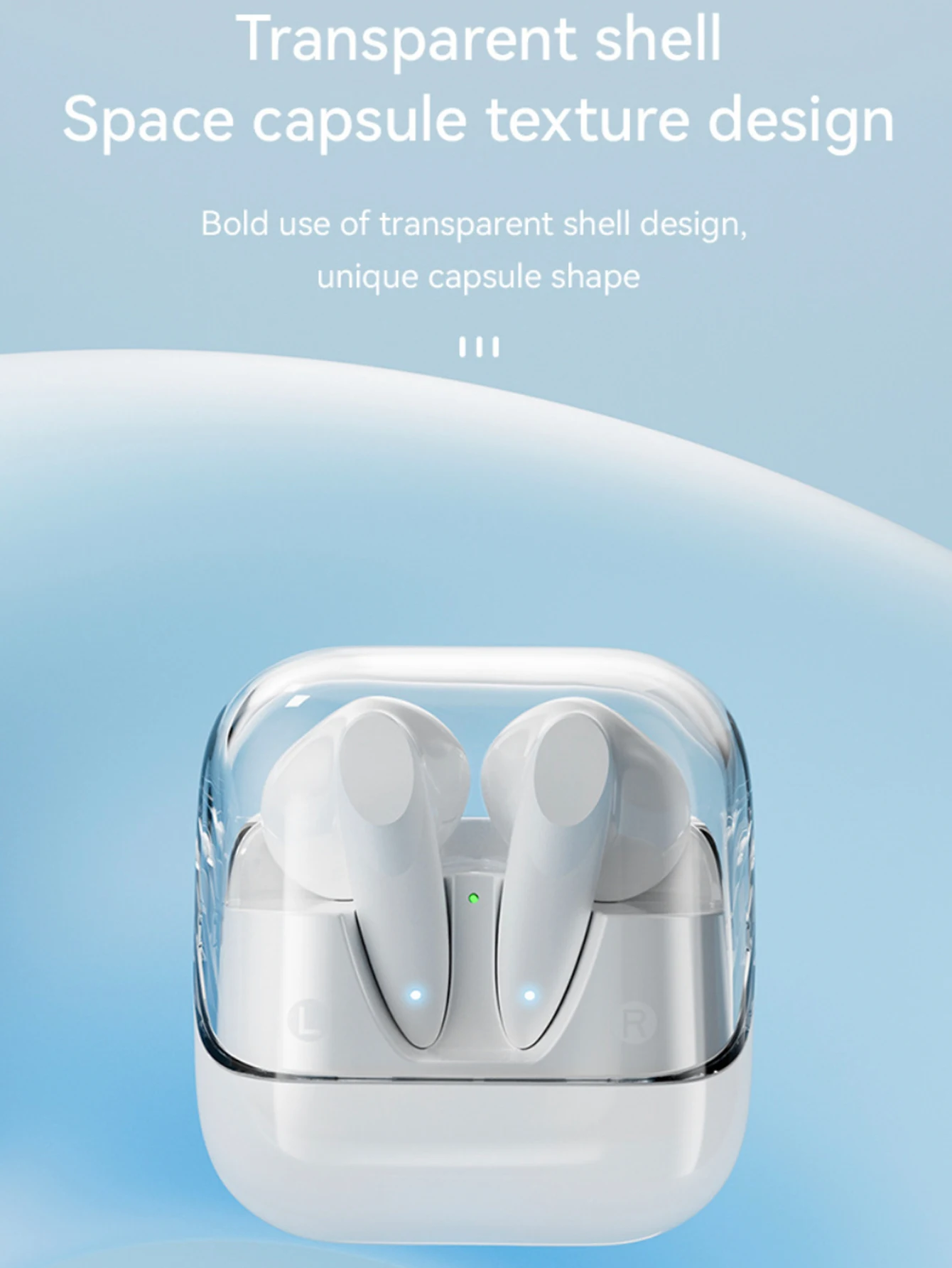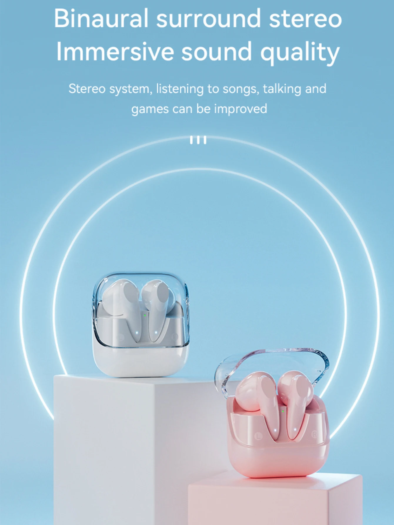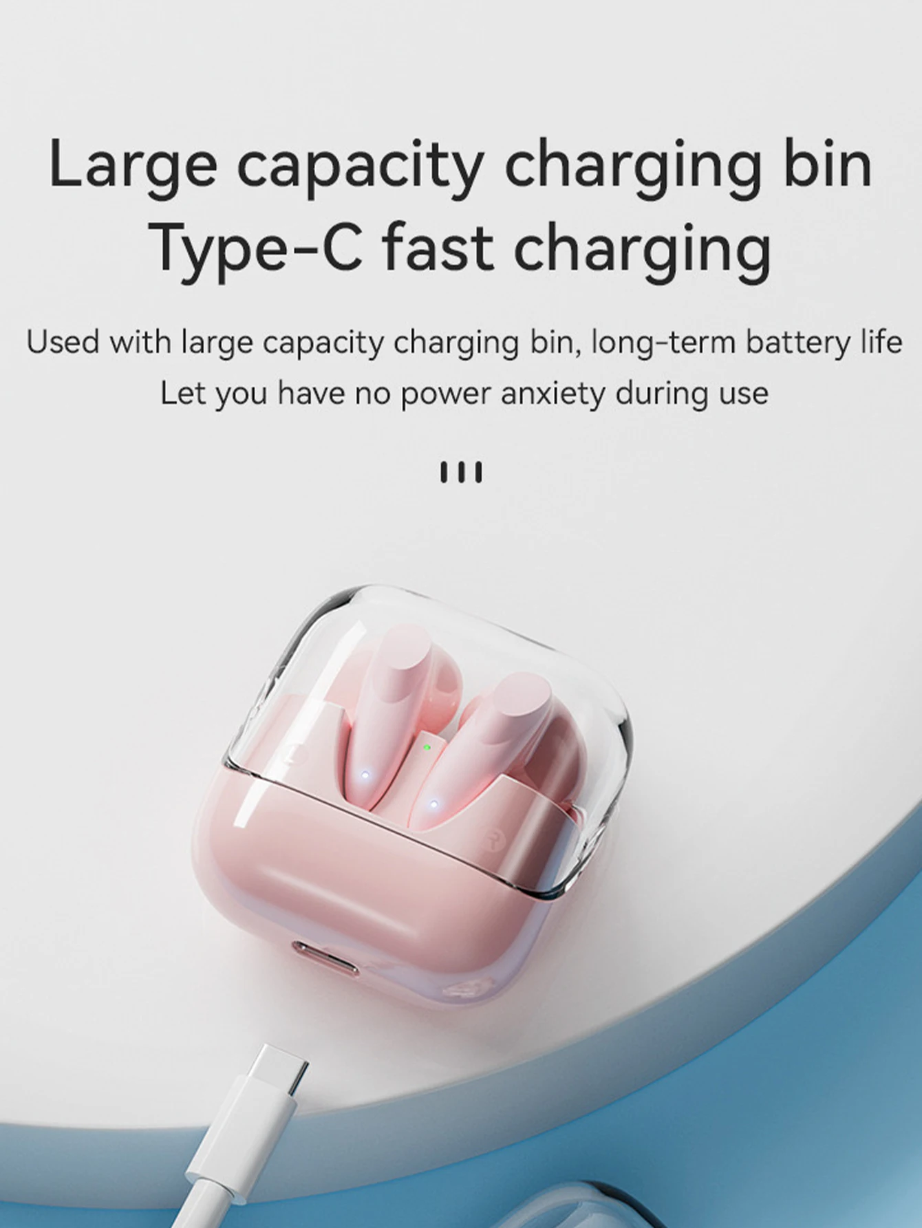 Mini auriculares inalámbricos intrauditivos con estuche transparente, alta duración de la batería, auriculares Bluetooth con cancelación de ruido y baja latencia