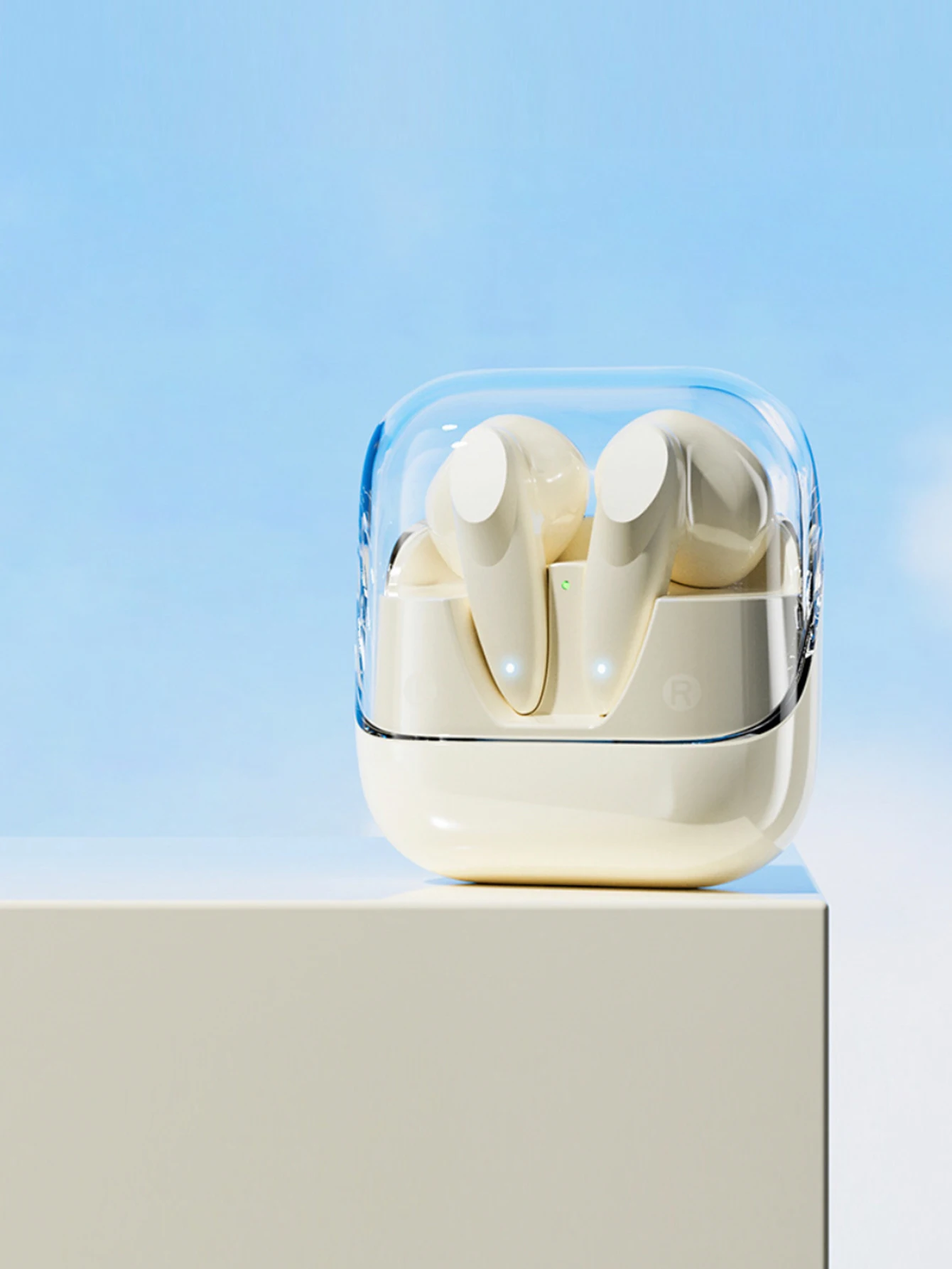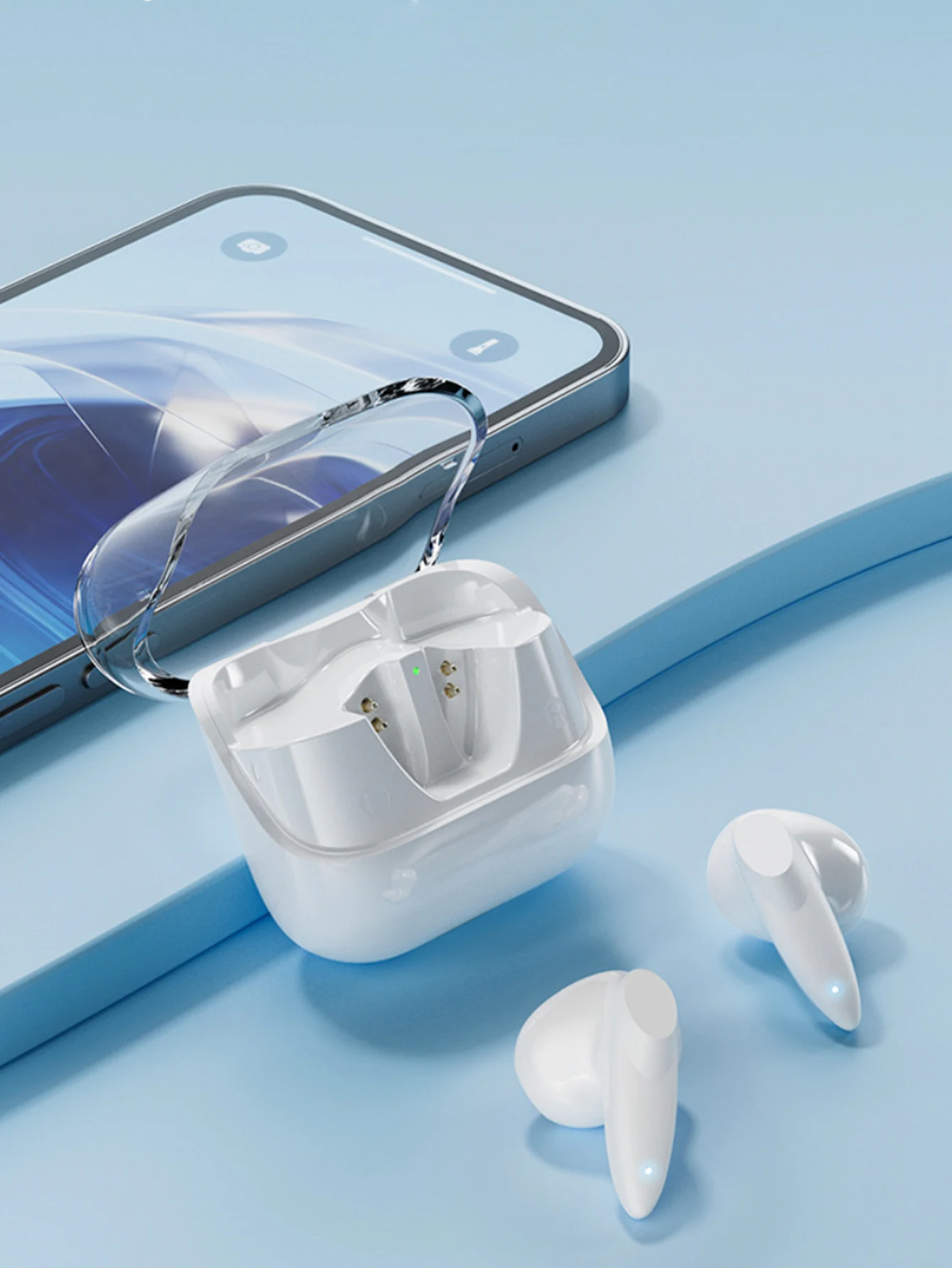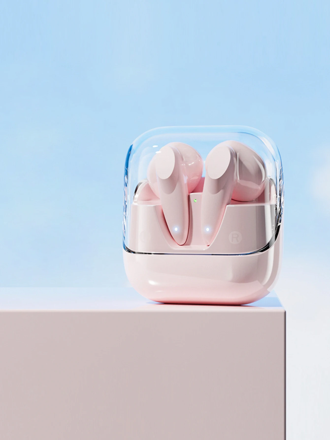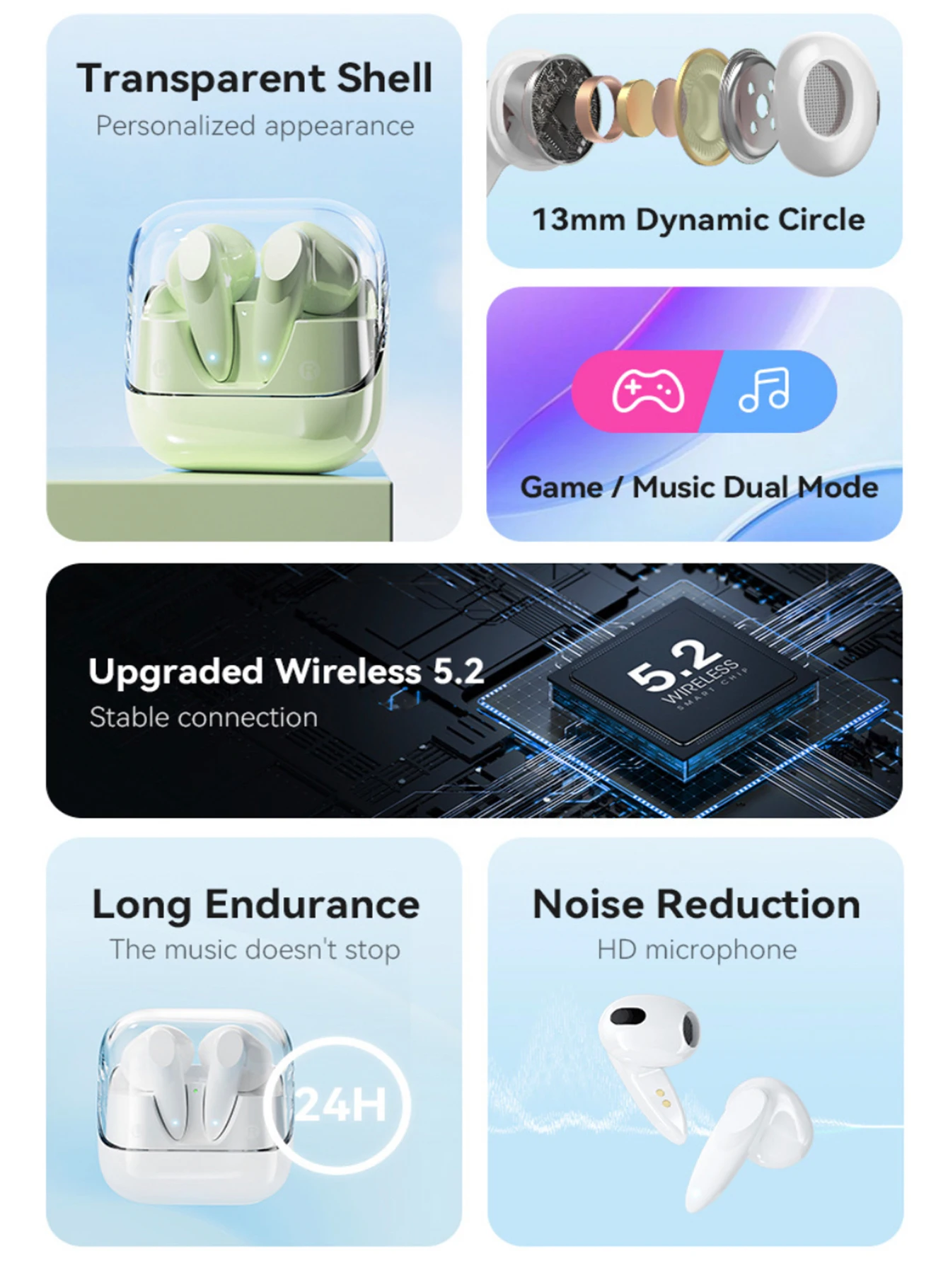 Mini auriculares inalámbricos intrauditivos con estuche transparente, alta duración de la batería, auriculares Bluetooth con cancelación de ruido y baja latencia