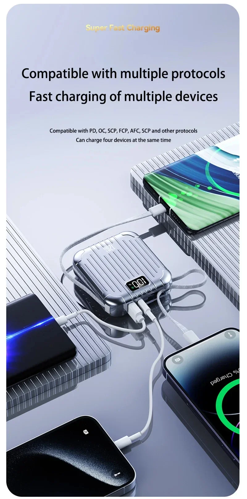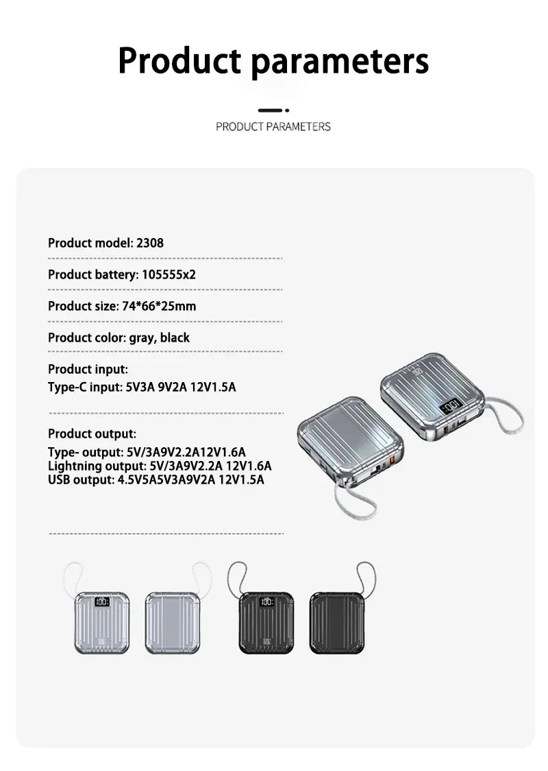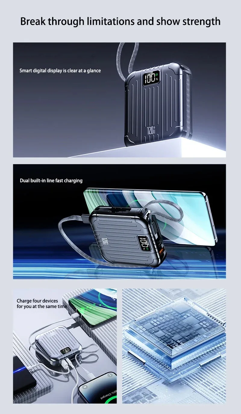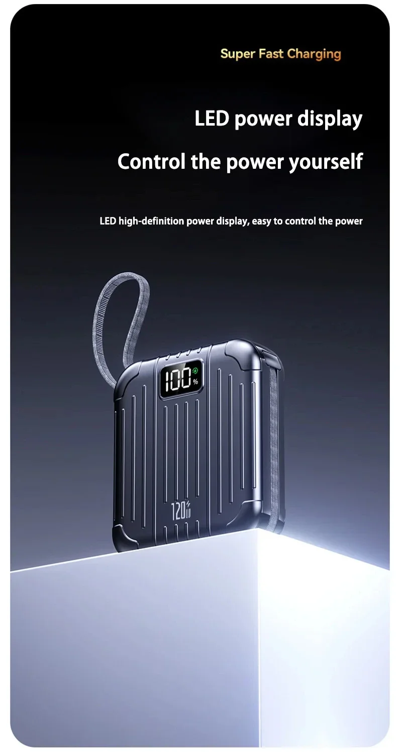 Haute capacité :Avec une énorme capacité de 50 000 mAh, cette banque d'alimentation garantit que vous ne manquerez jamais de batterie lorsque vous en avez le plus besoin.Il fournit plusieurs charges pour vos appareils.Technologie de charge rapide :Équipée d'une technologie avancée de charge rapide, cette banque d'alimentation offre une charge rapide et efficace à vos appareils, vous faisant gagner un temps précieux et vous gardant connecté lorsque vous êtes en déplacement.Doubles interfaces :Dotée d'interfaces Type-C et Lightning, cette banque d'alimentation offre des options de charge polyvalentes, répondant à divers appareils et préférences de l'utilisateur.Vous pouvez désormais charger facilement vos appareils Apple et Android.Conception de support intégrée :La conception innovante du support vous permet de soutenir vos appareils pendant qu'ils sont en charge, offrant une expérience visuelle mains libres pratique.Élégant et portable :Avec son design compact en forme de capsule, cette banque d'alimentation est non seulement élégante mais également très portable.Glissez-le dans votre sac ou votre poche et emportez-le avec vous partout où vous allez, vous assurant ainsi d'avoir toujours une alimentation de secours à portée de main.