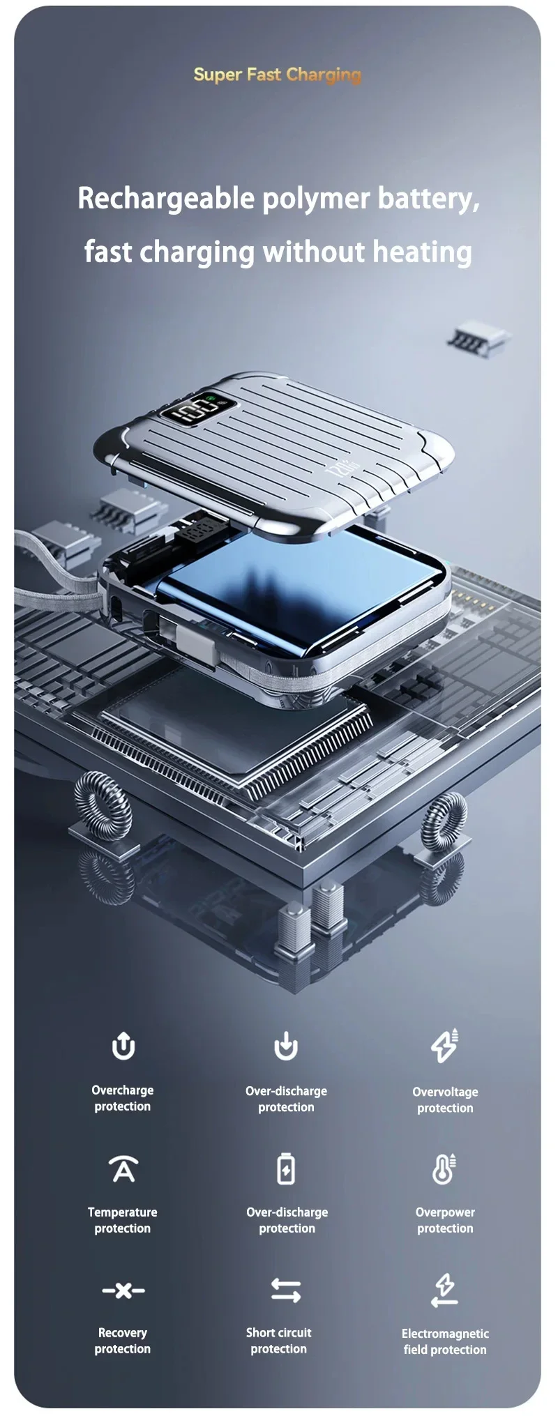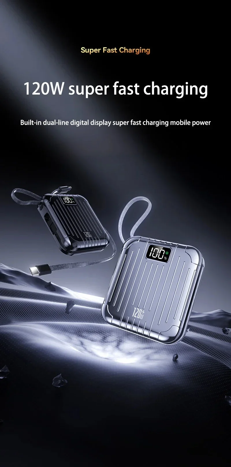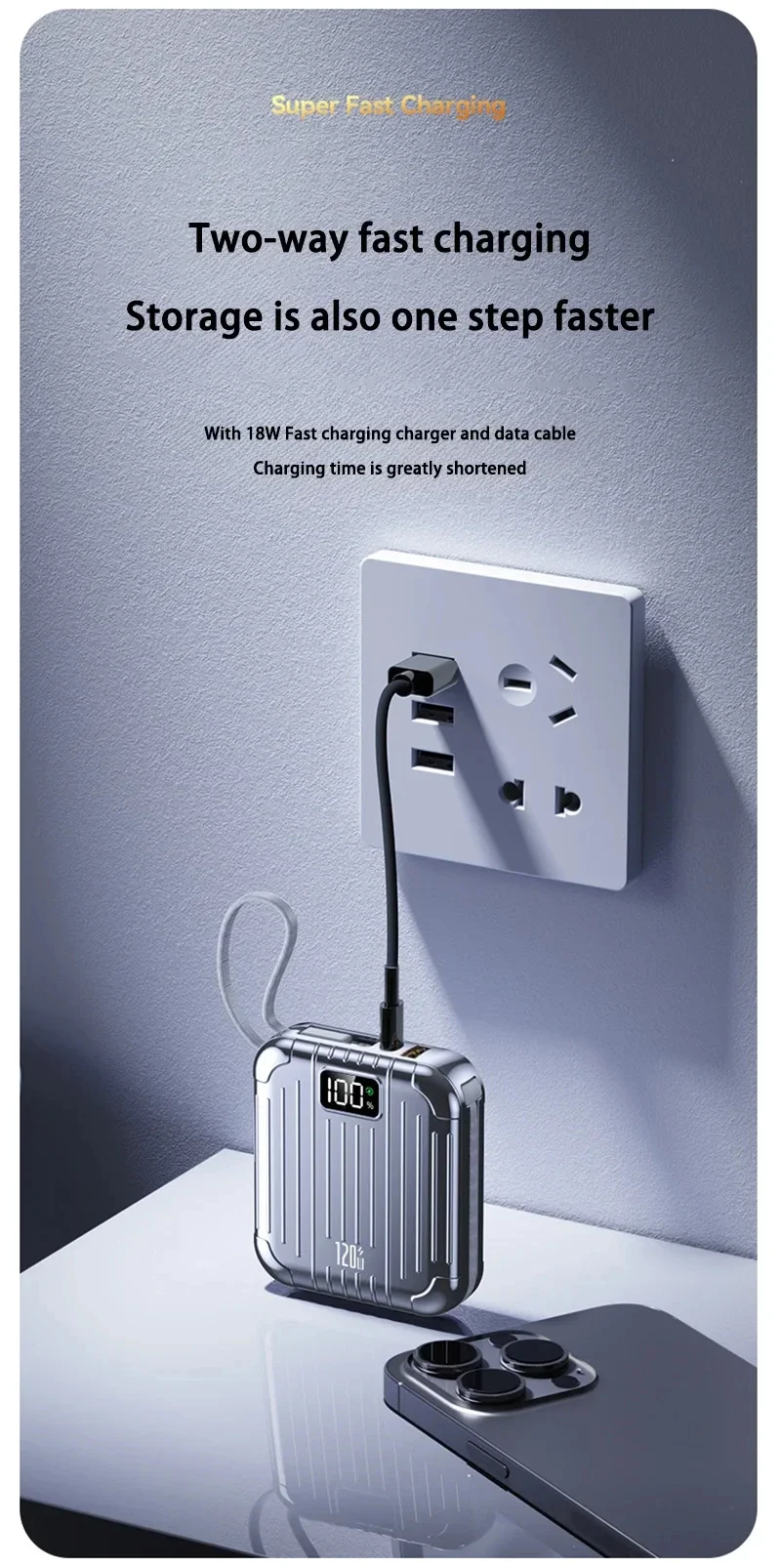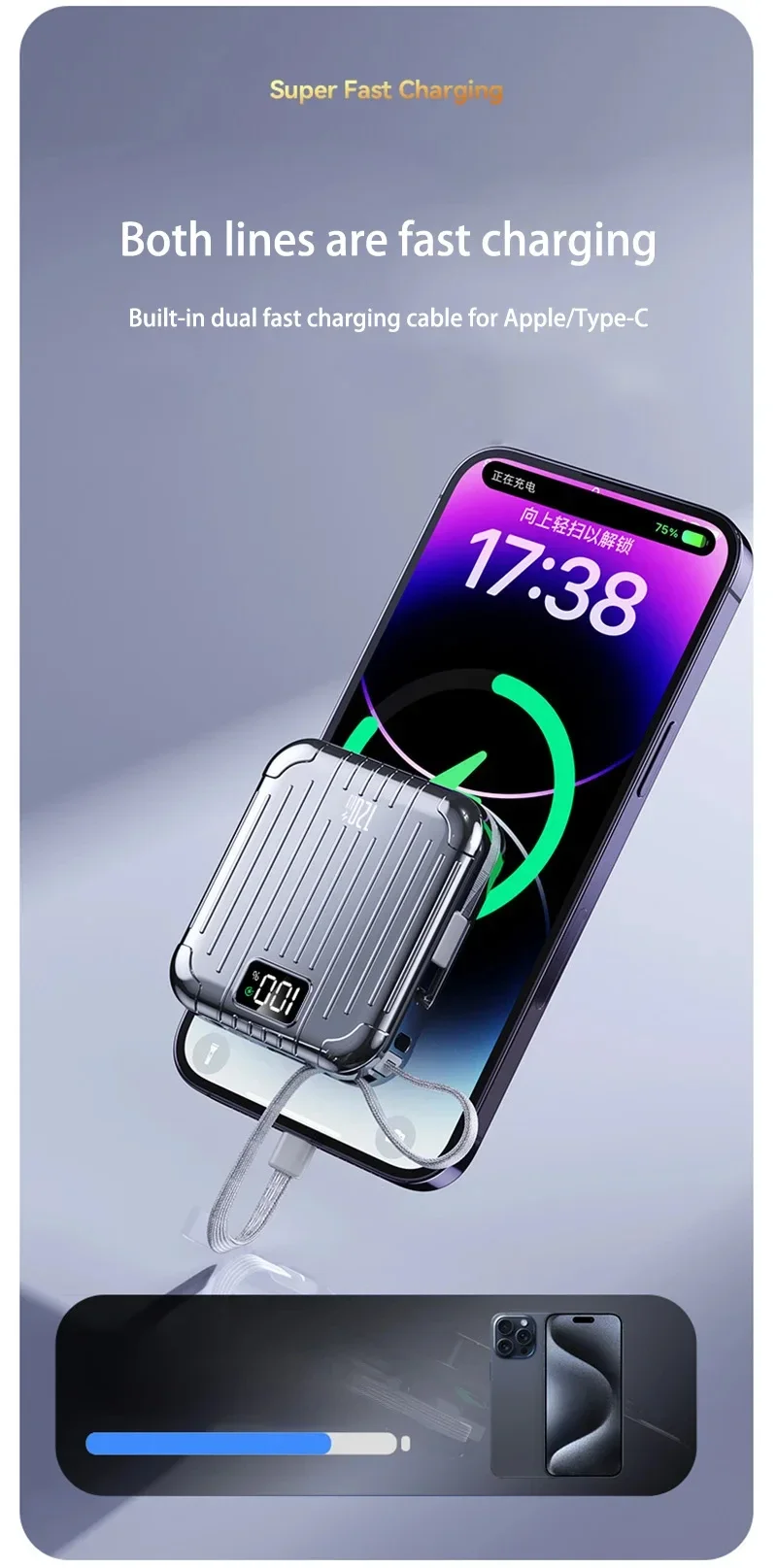 Haute capacité :Avec une énorme capacité de 50 000 mAh, cette banque d'alimentation garantit que vous ne manquerez jamais de batterie lorsque vous en avez le plus besoin.Il fournit plusieurs charges pour vos appareils.Technologie de charge rapide :Équipée d'une technologie avancée de charge rapide, cette banque d'alimentation offre une charge rapide et efficace à vos appareils, vous faisant gagner un temps précieux et vous gardant connecté lorsque vous êtes en déplacement.Doubles interfaces :Dotée d'interfaces Type-C et Lightning, cette banque d'alimentation offre des options de charge polyvalentes, répondant à divers appareils et préférences de l'utilisateur.Vous pouvez désormais charger facilement vos appareils Apple et Android.Conception de support intégrée :La conception innovante du support vous permet de soutenir vos appareils pendant qu'ils sont en charge, offrant une expérience visuelle mains libres pratique.Élégant et portable :Avec son design compact en forme de capsule, cette banque d'alimentation est non seulement élégante mais également très portable.Glissez-le dans votre sac ou votre poche et emportez-le avec vous partout où vous allez, vous assurant ainsi d'avoir toujours une alimentation de secours à portée de main.